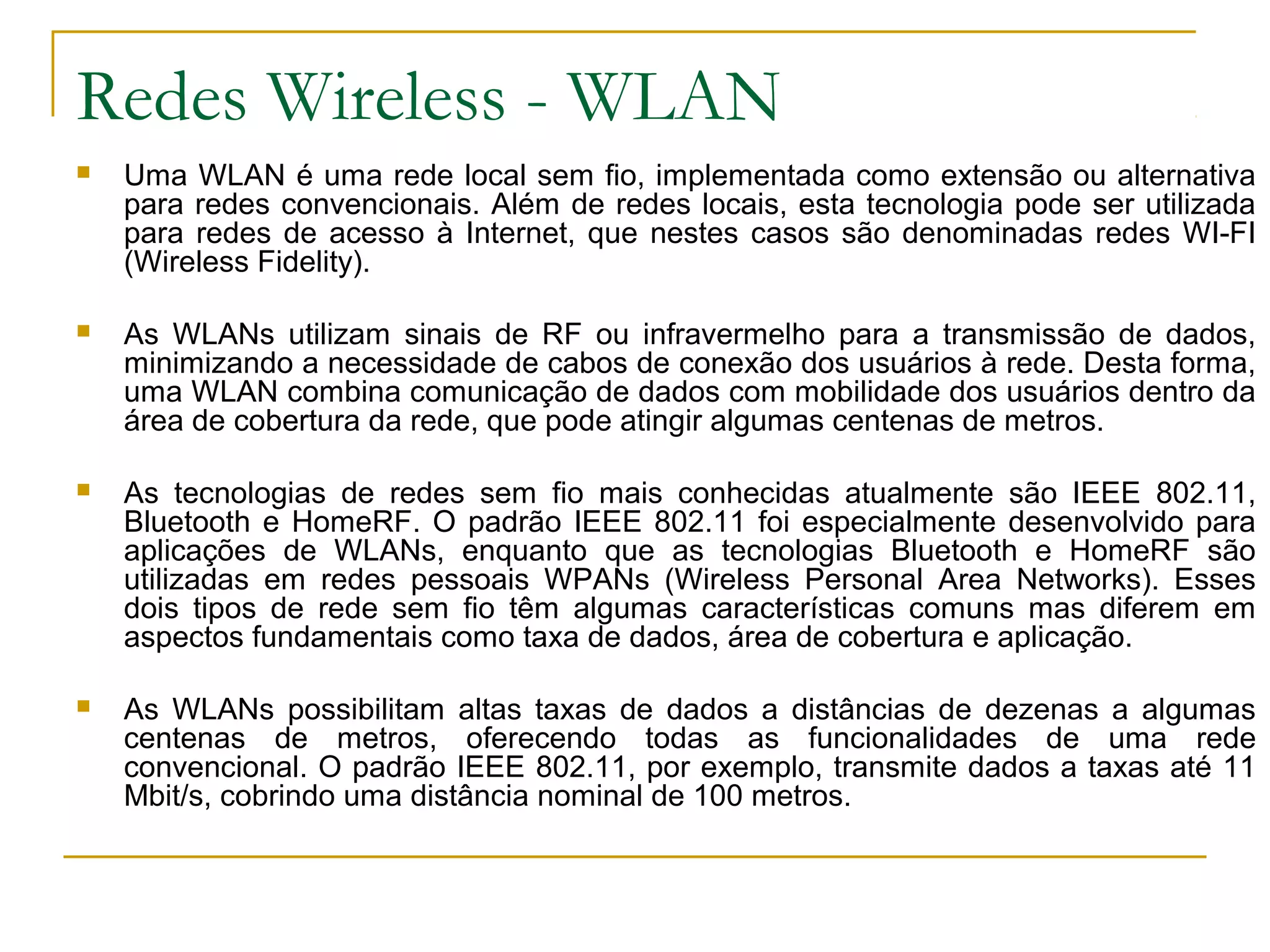Uma WLAN é uma rede sem fio local que usa sinais de rádio ou infravermelho para transmitir dados sem fio, permitindo mobilidade dentro da área de cobertura. Os padrões IEEE 802.11 definem as especificações técnicas para WLANs, incluindo taxas de transferência de dados e distâncias de cobertura. WLANs conectam dispositivos móveis a redes convencionais através de pontos de acesso.