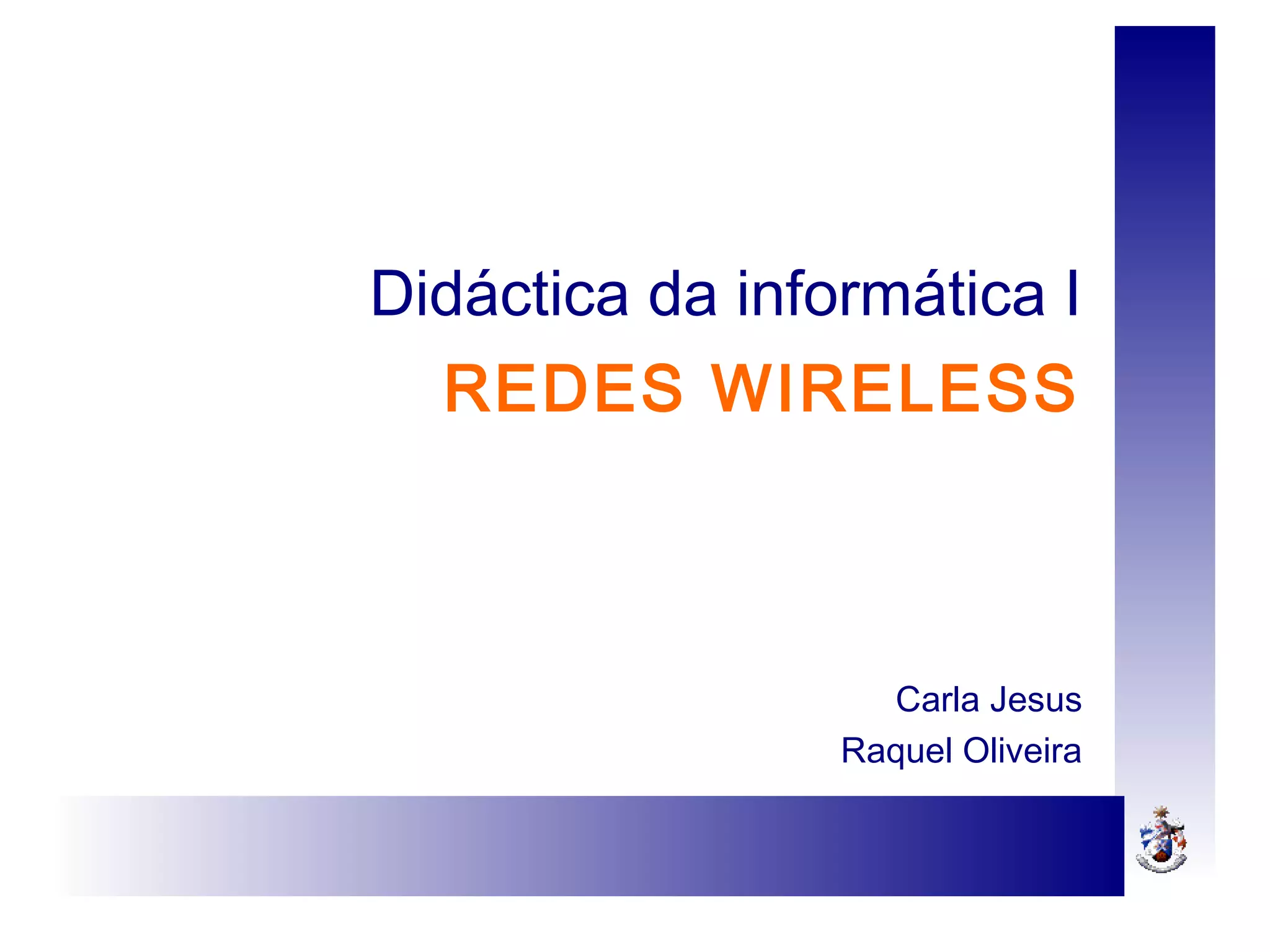 O documento aborda a didática da informática e redes wireless, analisando a popularidade crescente de equipamentos sem fio em Portugal e as tecnologias de rádio como Wi-Fi e Bluetooth. Discute também a configuração de redes wireless, segurança, hotspots, e iniciativas como o campus virtual e-u que visam integrar serviços para estudantes. Além disso, destaca a falta de sensibilização para a segurança em redes wireless entre os usuários portugueses.