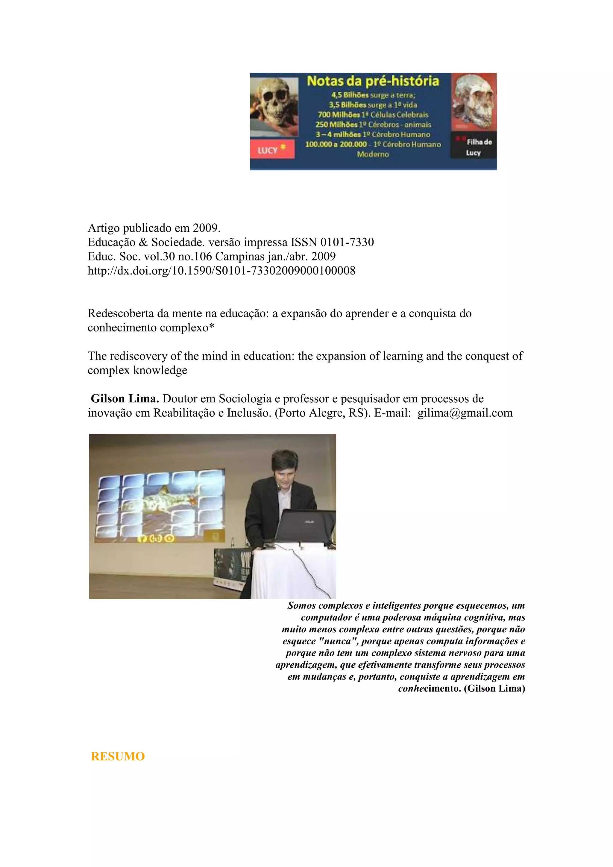 Este artigo discute como a compreensão moderna da mente humana influencia a educação. Ao longo da história, houve debates sobre qual órgão do corpo era responsável pelo pensamento. Agora sabemos que é o cérebro. Recentes descobertas nas neurociências mostraram que emoções são essenciais para a aprendizagem. O artigo argumenta que é necessário ir além de uma abordagem puramente cognitiva na educação para promover o aprendizado complexo.