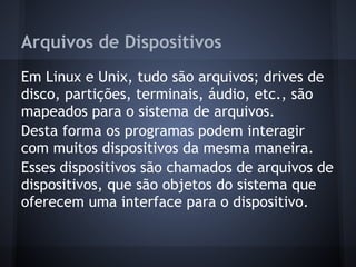 O documento discute processos, arquivos de dispositivos, descritores de arquivos padrão, pipes, redirecionamento e comandos para gerenciamento de processos em Linux. É explicado que tudo é tratado como arquivos, incluindo dispositivos, e que pipes e redirecionamento permitem conectar a saída de um programa à entrada de outro.