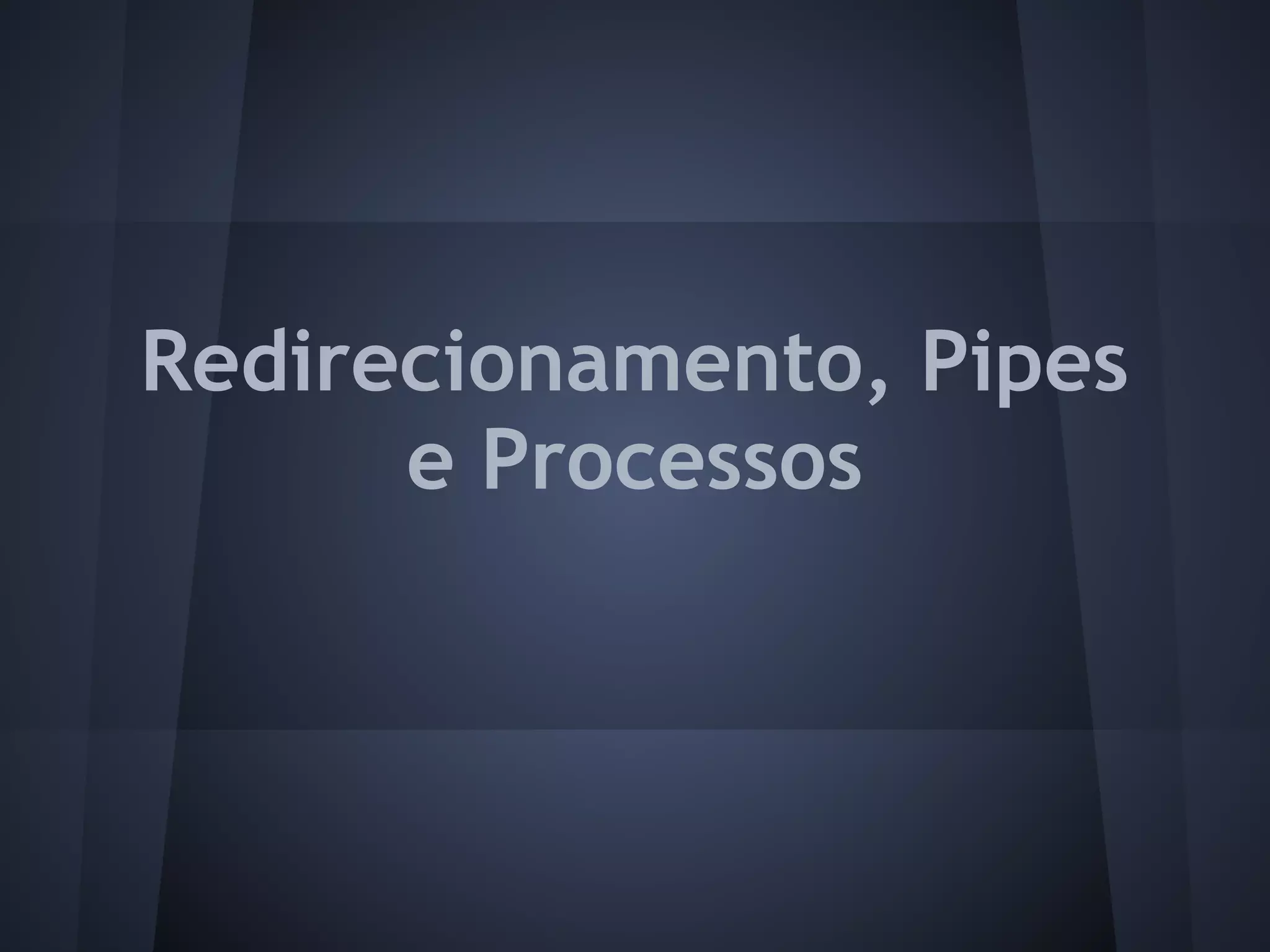 O documento discute processos, arquivos de dispositivos, descritores de arquivos padrão, pipes, redirecionamento e comandos para gerenciamento de processos em Linux. É explicado que tudo é tratado como arquivos, incluindo dispositivos, e que pipes e redirecionamento permitem conectar a saída de um programa à entrada de outro.