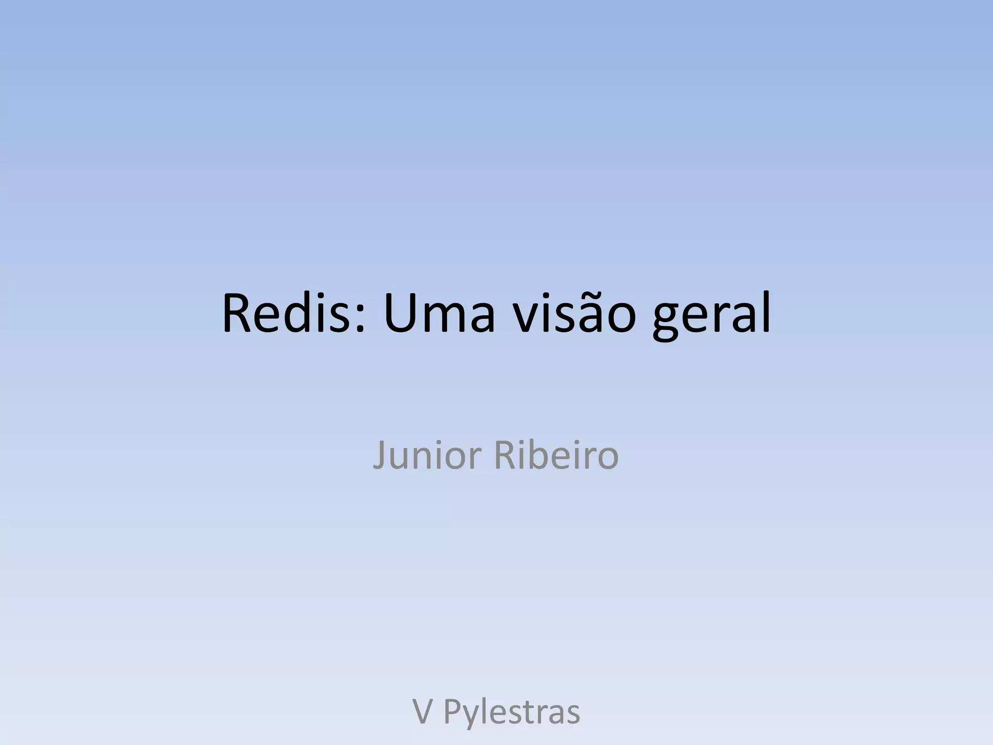 O documento fornece uma visão geral do Redis, um banco de dados em memória open source. Ele descreve as principais características do Redis, como armazenamento de chaves-valores, listas, conjuntos e conjuntos ordenados. Além disso, explica alguns casos de uso comuns do Redis, como contagem, sessões e filas.