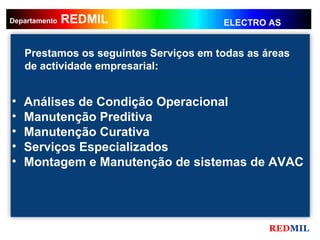 Este documento descreve os serviços de termografia e manutenção especializada oferecidos pela empresa REDMIL. A empresa fornece análises de condição operacional, manutenção preditiva e corretiva, montagem e manutenção de sistemas AVAC, utilizando termografia e outros métodos não destrutivos como ultravioletas e ultrassons. A REDMIL tem mais de 25 anos de experiência em termografia e atende uma variedade de clientes industriais e de serviços.