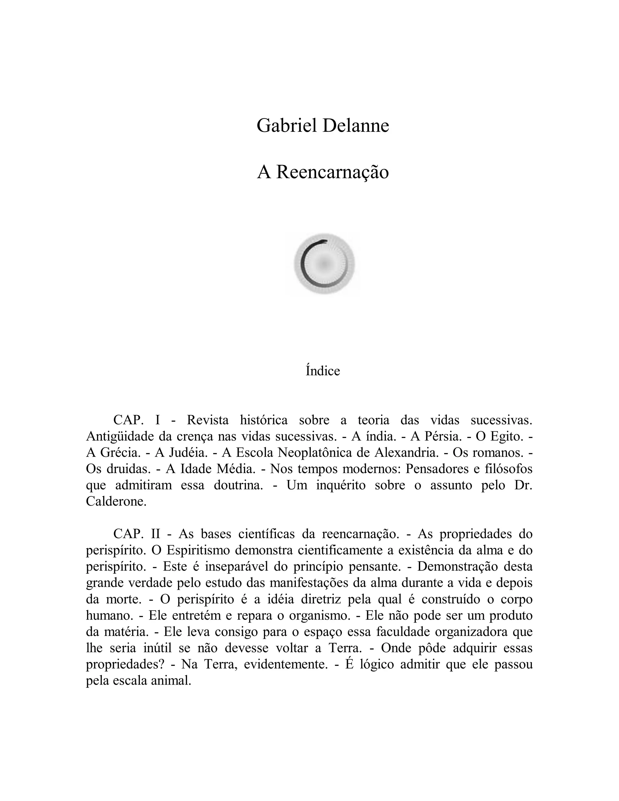 O documento discute a teoria da reencarnação ao longo de 14 capítulos, apresentando evidências históricas, científicas e casos específicos. Defende que a alma é imortal e carrega consigo propriedades adquiridas através de vidas passadas, e que a reencarnação explica fenômenos como crianças-prodígio e lembranças de vidas anteriores.