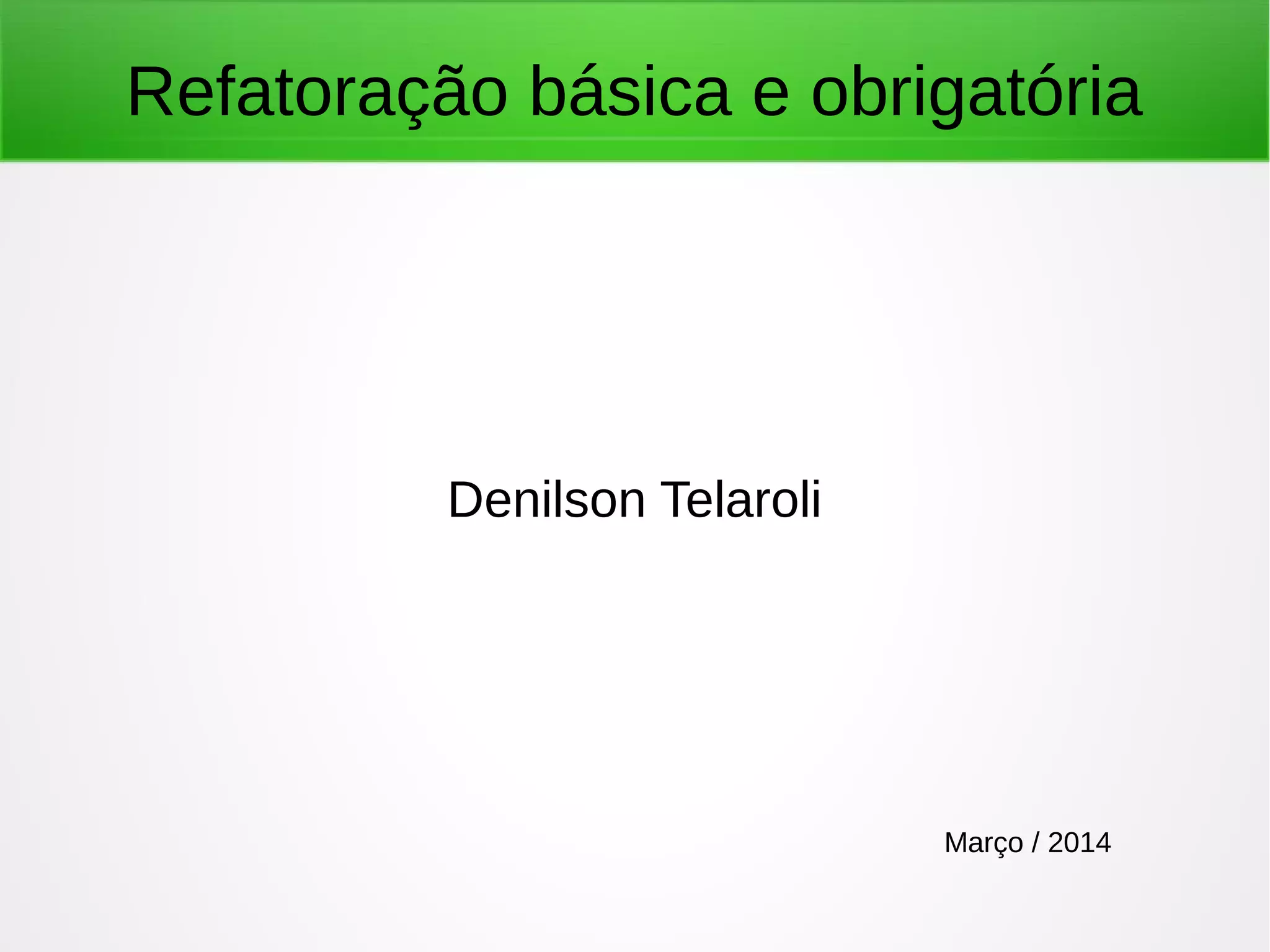 O documento discute refatoração de código, que é o processo de reestruturar código existente para torná-lo mais legível, manutenível e reutilizável. Ele lista sintomas que indicam a necessidade de refatoração, como código duplicado, e técnicas de refatoração como extrair métodos ou substituir valores temporários por consultas.