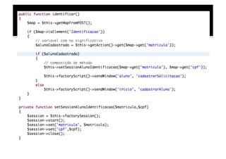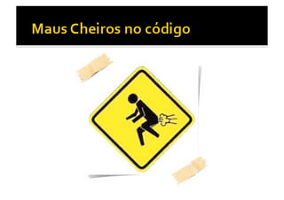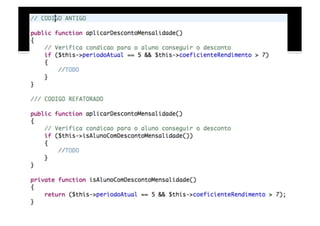 O documento discute refatoração de código, que é o processo de melhorar a estrutura interna de um software sem alterar seu comportamento externo. Isso melhora o projeto do código, facilita entendimento, ajuda a encontrar falhas e permite programar mais rapidamente. A refatoração envolve dividir o trabalho em adicionar funcionalidade e refatorar o código. Vários métodos de refatoração são descritos como compor métodos, internalizar variáveis explicativas e substituir algoritmos. Princípios como nomes significativos e funções focadas em uma