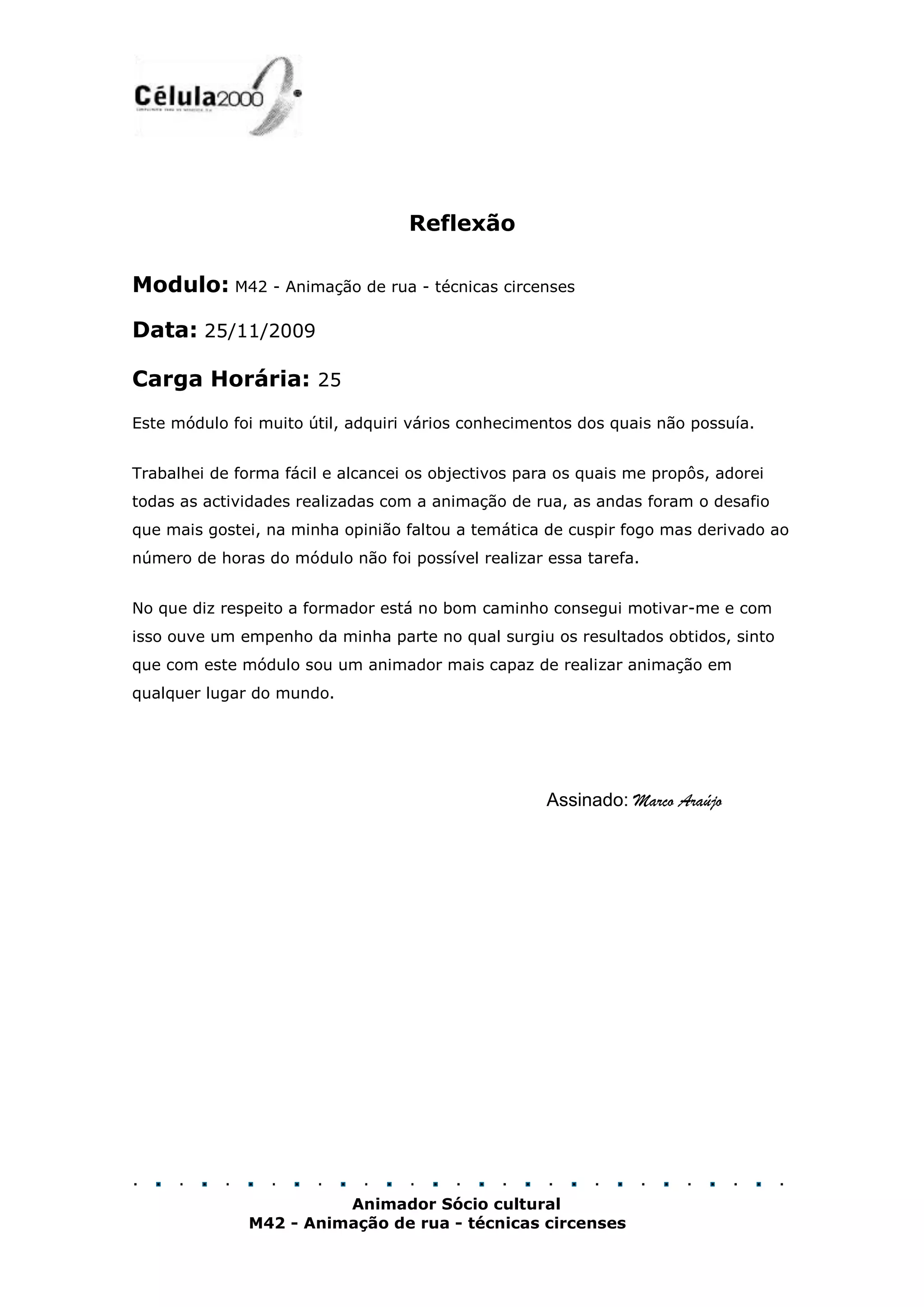 Este aluno reflete sobre um módulo de animação de rua e técnicas circenses de 25 horas de duração. Ele aprendeu vários novos conhecimentos e conseguiu alcançar os objetivos propostos, especialmente gostando das atividades de animação de rua e das andas. Embora tenha gostado de aprender sobre cuspir fogo, o tempo do módulo não permitiu isso. O formador o motivou bem e agora se sente capaz de realizar animações em qualquer lugar.