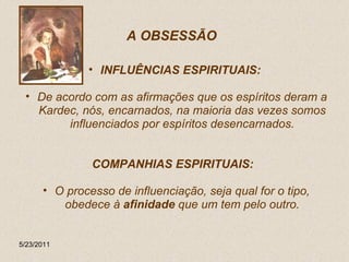 O documento discute obsessão espiritual, definindo-a como a ação persistente de um espírito mau sobre outro. Explica que a obsessão geralmente ocorre gradualmente e que existem diferentes tipos, e que estados emocionais como tristeza ou ódio podem predispor alguém à obsessão. Também descreve formas de tratar a obsessão, incluindo mudança moral, desobsessão, oração e trabalho pelo bem.