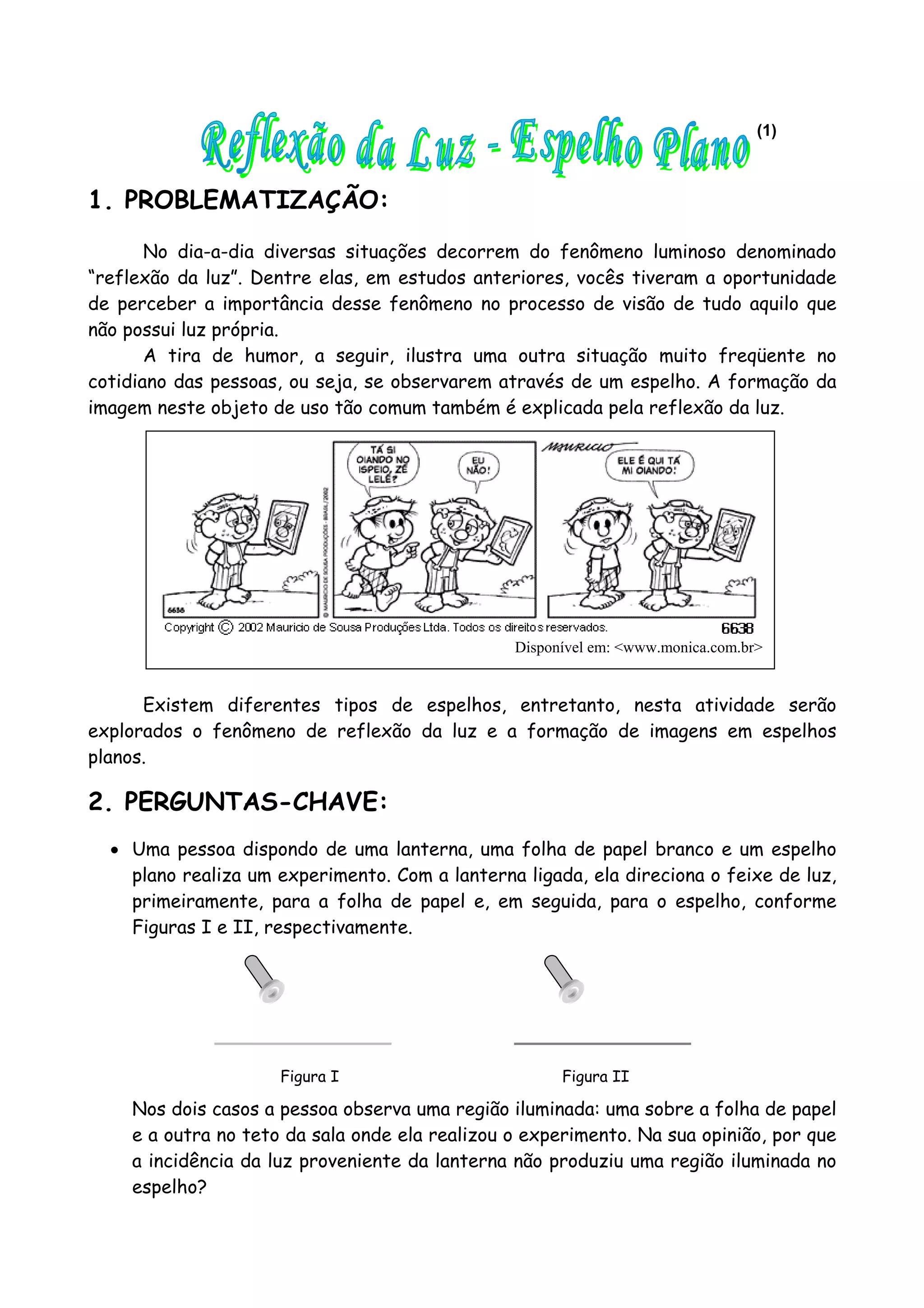 O documento apresenta um plano de aula sobre reflexão da luz e formação de imagens em espelhos planos. O plano inclui uma problematização do tema, perguntas para os alunos, conceitos-chave, atividades em grupo e sugestões de avaliação. O objetivo é introduzir o fenômeno da reflexão da luz e explicar como os espelhos planos formam imagens virtuais, direitas e do mesmo tamanho que o objeto.