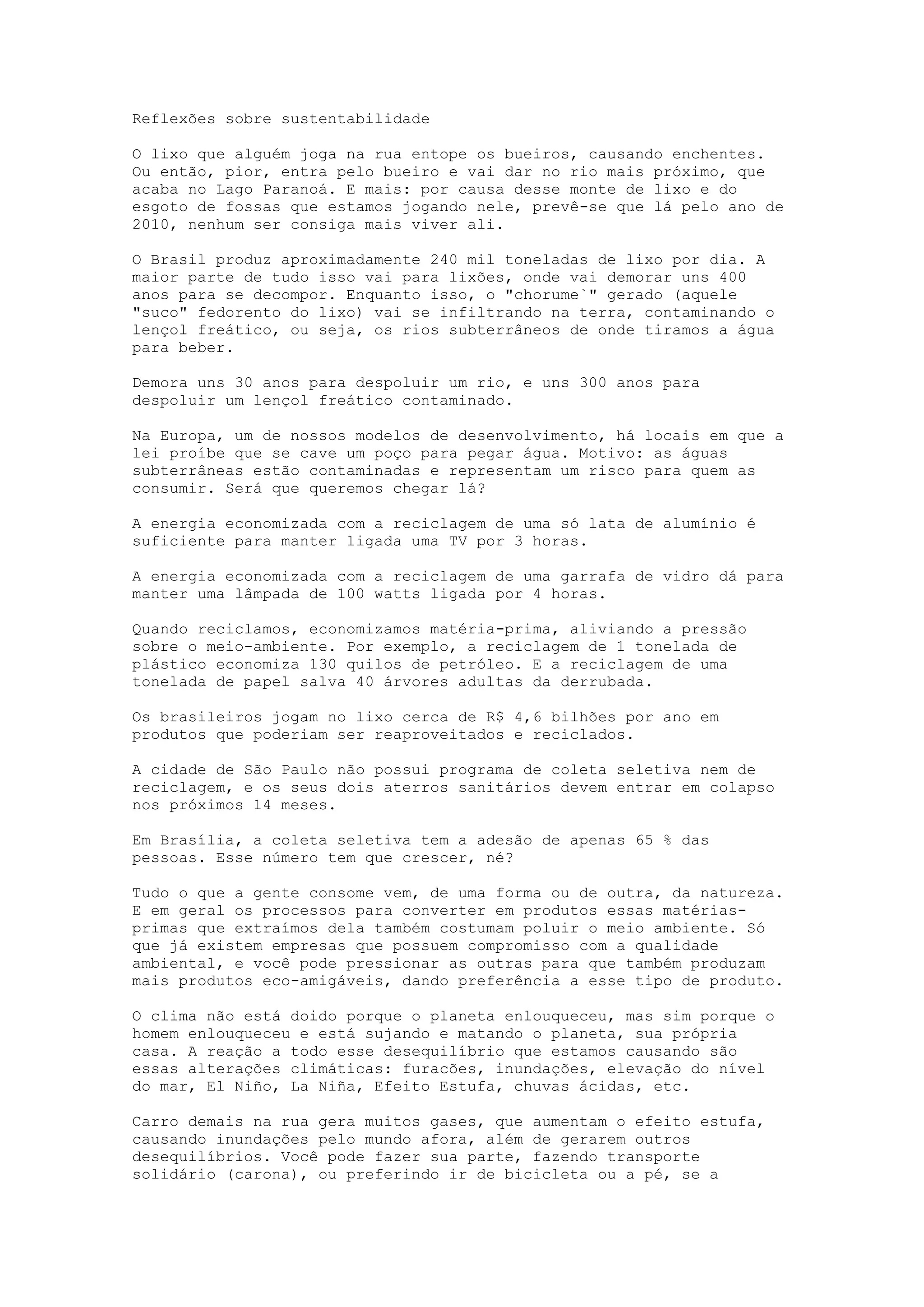 O documento discute os problemas causados pelo lixo, como enchentes e contaminação de rios e lençóis freáticos. Também destaca a importância da reciclagem para economizar recursos naturais e reduzir a poluição.