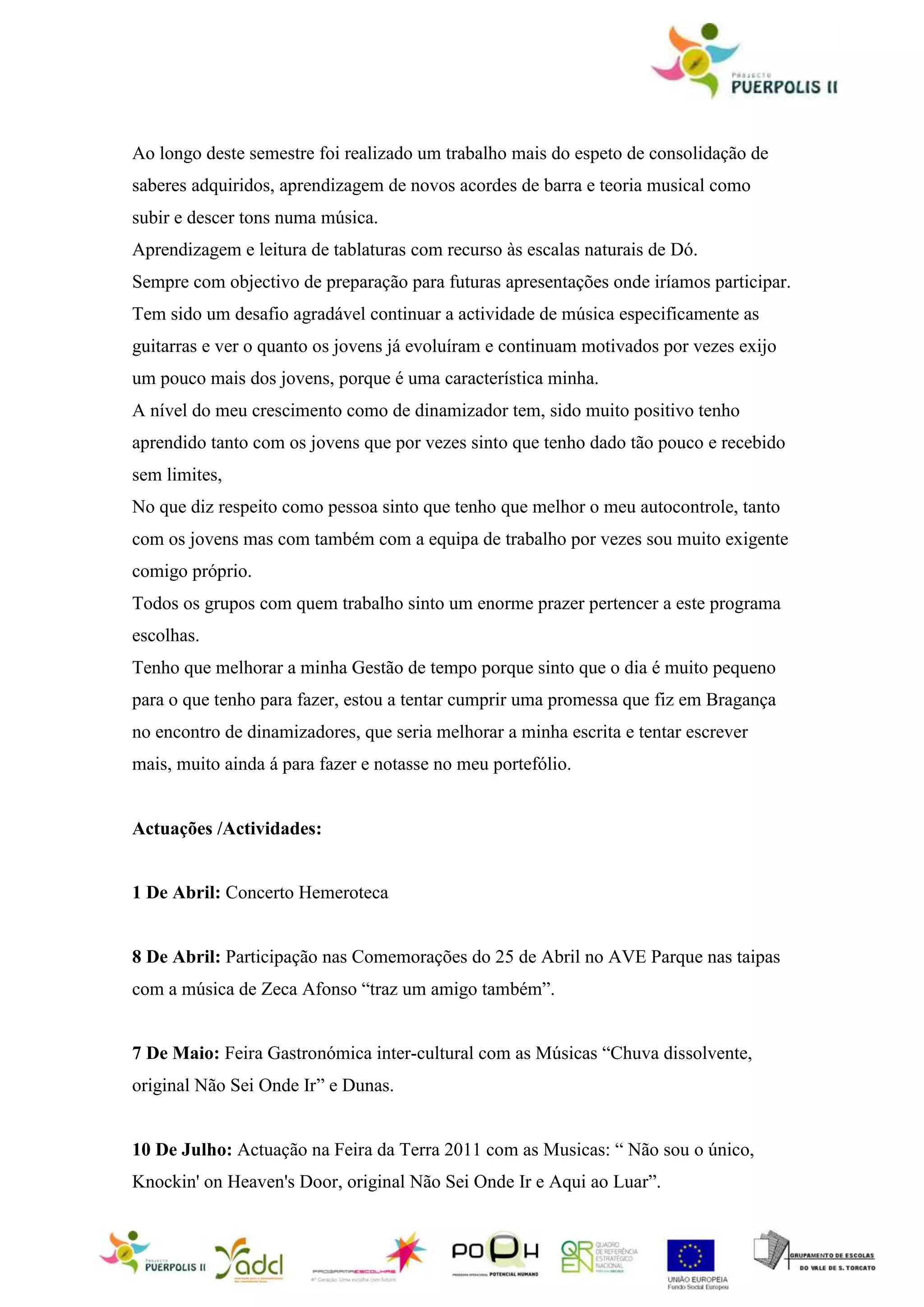 Este documento descreve as atividades musicais realizadas durante um semestre com jovens, incluindo aprendizagem de novos acordes, teoria musical e leitura de tablaturas. Também discute o crescimento do dinamizador e áreas para melhoria, como gestão do tempo e escrita.