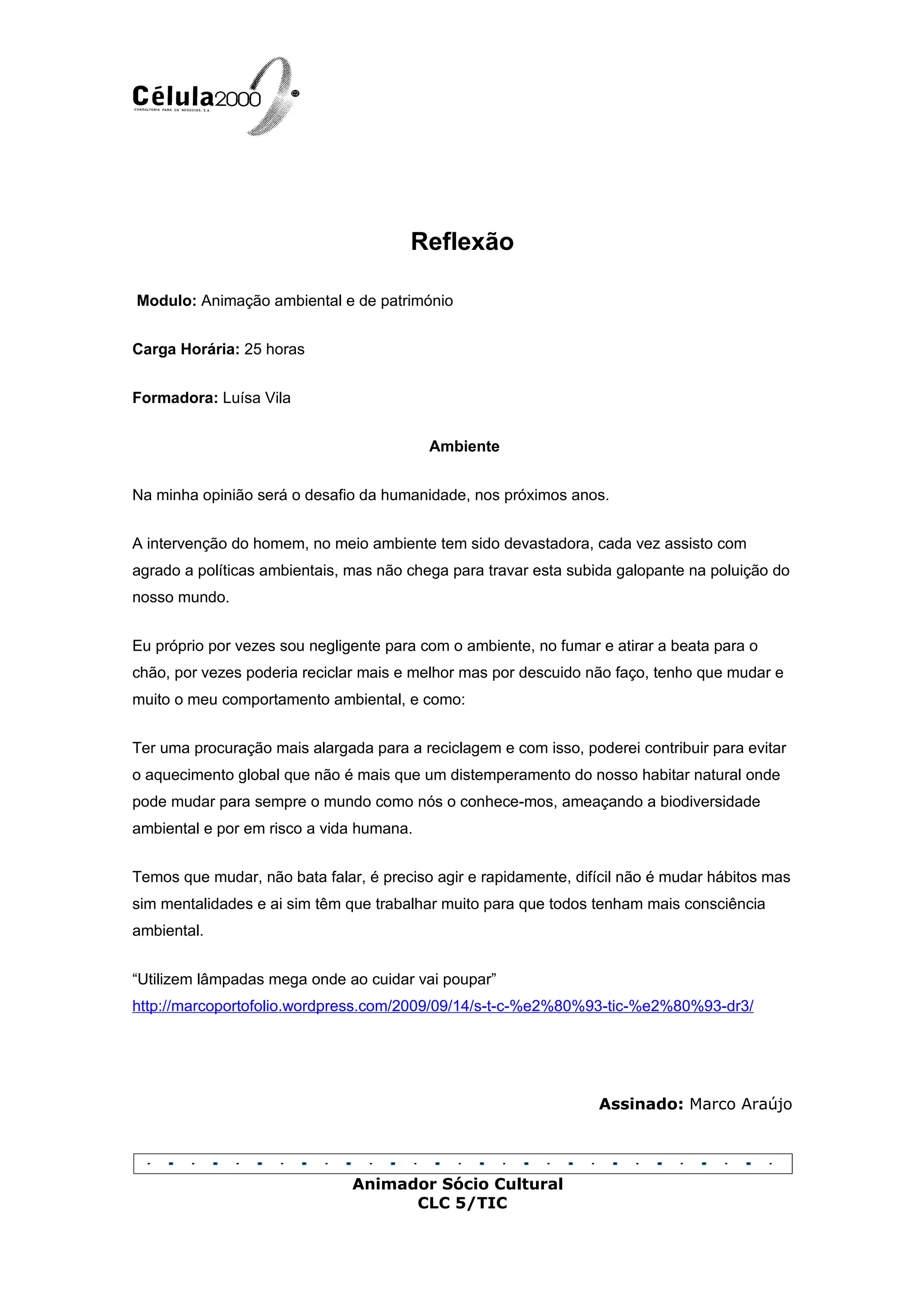 O documento discute os desafios ambientais da humanidade e a necessidade de mudança de comportamentos e mentalidades. Reflete sobre como as intervenções humanas têm devastado o meio ambiente e como pequenas ações como reciclar mais e evitar jogar bitucas no chão podem fazer a diferença. Conclui que é preciso agir rapidamente para proteger a biodiversidade e a vida humana das consequências das mudanças climáticas.