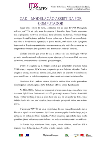 O documento descreve o programa de modelagem assistida por computador (CAD) ensinado no Centro de Formação Profissional da indústria Têxtil, Vestuário, Confeção e Lanifícios. A autora aprende sobre os benefícios do CAD, mas prefere trabalhar com modelagem manual. Uma nova instrutora torna as aulas de CAD mais práticas e fáceis de entender para a autora.