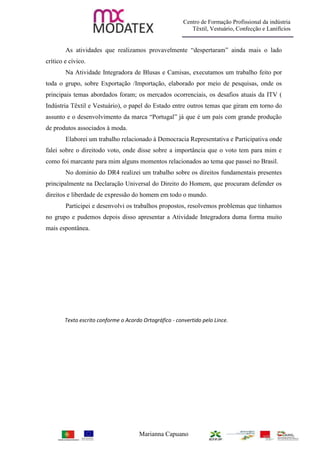 O documento discute as atividades realizadas por estudantes em um centro de formação profissional sobre cidadania e democracia. Eles desenvolveram glossários, analisaram direitos constitucionais, e discutiram temas como deveres cívicos, voto, e direitos humanos. Os estudantes também completaram um projeto de grupo sobre a indústria têxtil que abordou exportação, importação e desafios do setor.