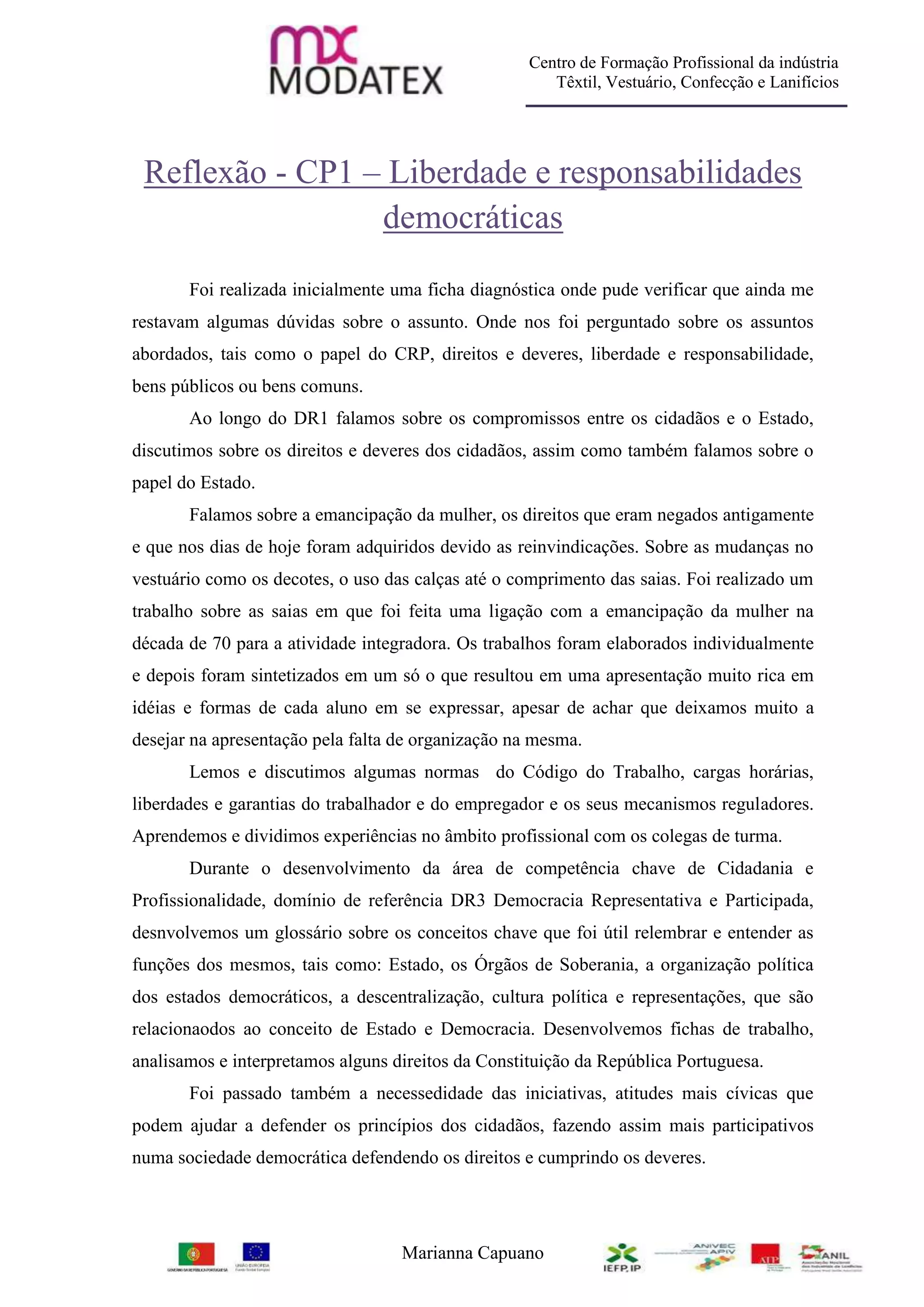 O documento discute as atividades realizadas por estudantes em um centro de formação profissional sobre cidadania e democracia. Eles desenvolveram glossários, analisaram direitos constitucionais, e discutiram temas como deveres cívicos, voto, e direitos humanos. Os estudantes também completaram um projeto de grupo sobre a indústria têxtil que abordou exportação, importação e desafios do setor.