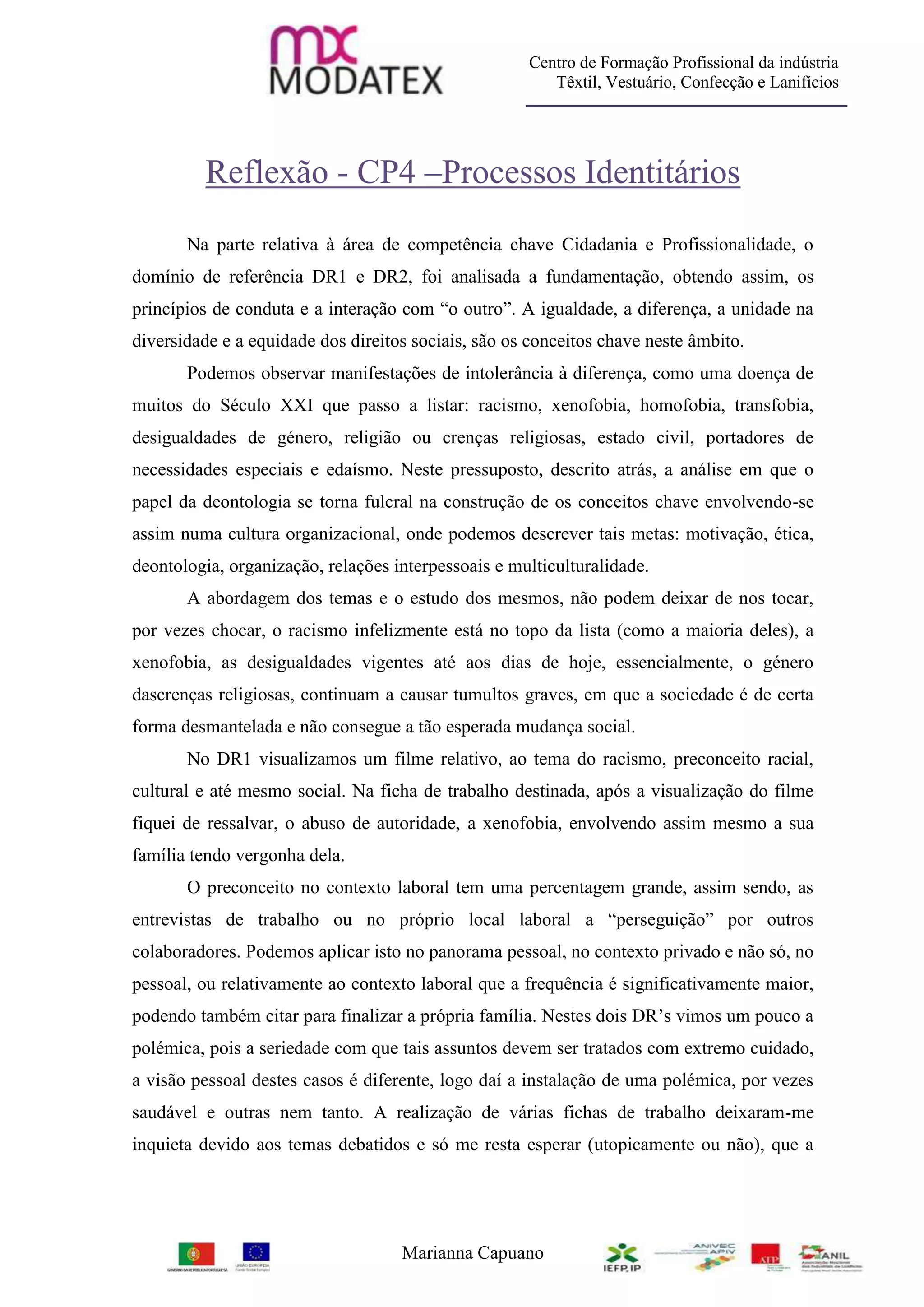 O documento discute questões de identidade e inclusão no contexto da cidadania e profissionalismo. Aborda conceitos-chave como igualdade, diferença e direitos sociais, bem como manifestações de intolerância como racismo, xenofobia e desigualdades de gênero. Reflete sobre como esses temas foram analisados em atividades de formação profissional e a esperança de que as políticas públicas promovam mais inclusão social no futuro.