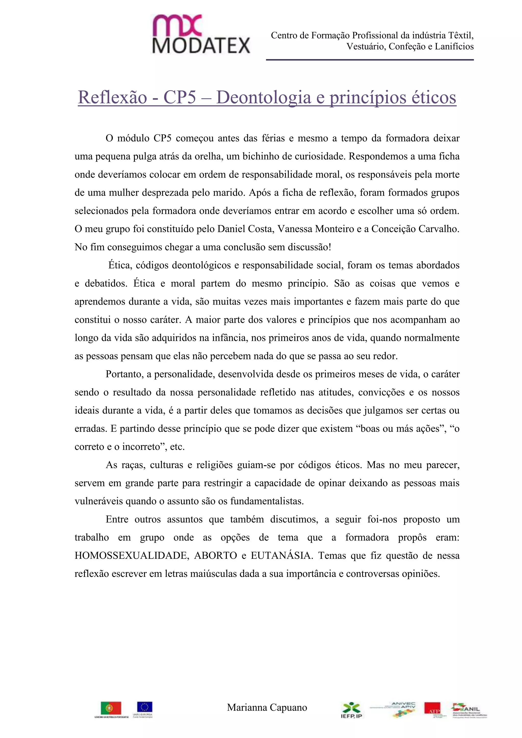 O documento descreve as atividades de um módulo de formação profissional sobre ética e deontologia. Os alunos discutiram temas como responsabilidade moral, códigos éticos e realizaram trabalhos em grupo sobre homossexualidade, aborto e eutanásia. A formação abordou a diferença entre ética individual e institucional e a dimensão ética da globalização.