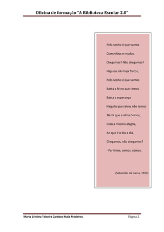 O documento descreve a reflexão final de uma oficina de formação sobre bibliotecas escolares 2.0. A autora discute como as bibliotecas precisam mudar para atender às necessidades atuais e futuras dos usuários, integrando ferramentas da Web 2.0. Ela avalia positivamente os objetivos e conteúdos da oficina por aprofundar seu conhecimento sobre o assunto. A autora conclui que é importante continuar explorando as novas ferramentas para reinventar os serviços da biblioteca e acompanhar as mudanças constantes na