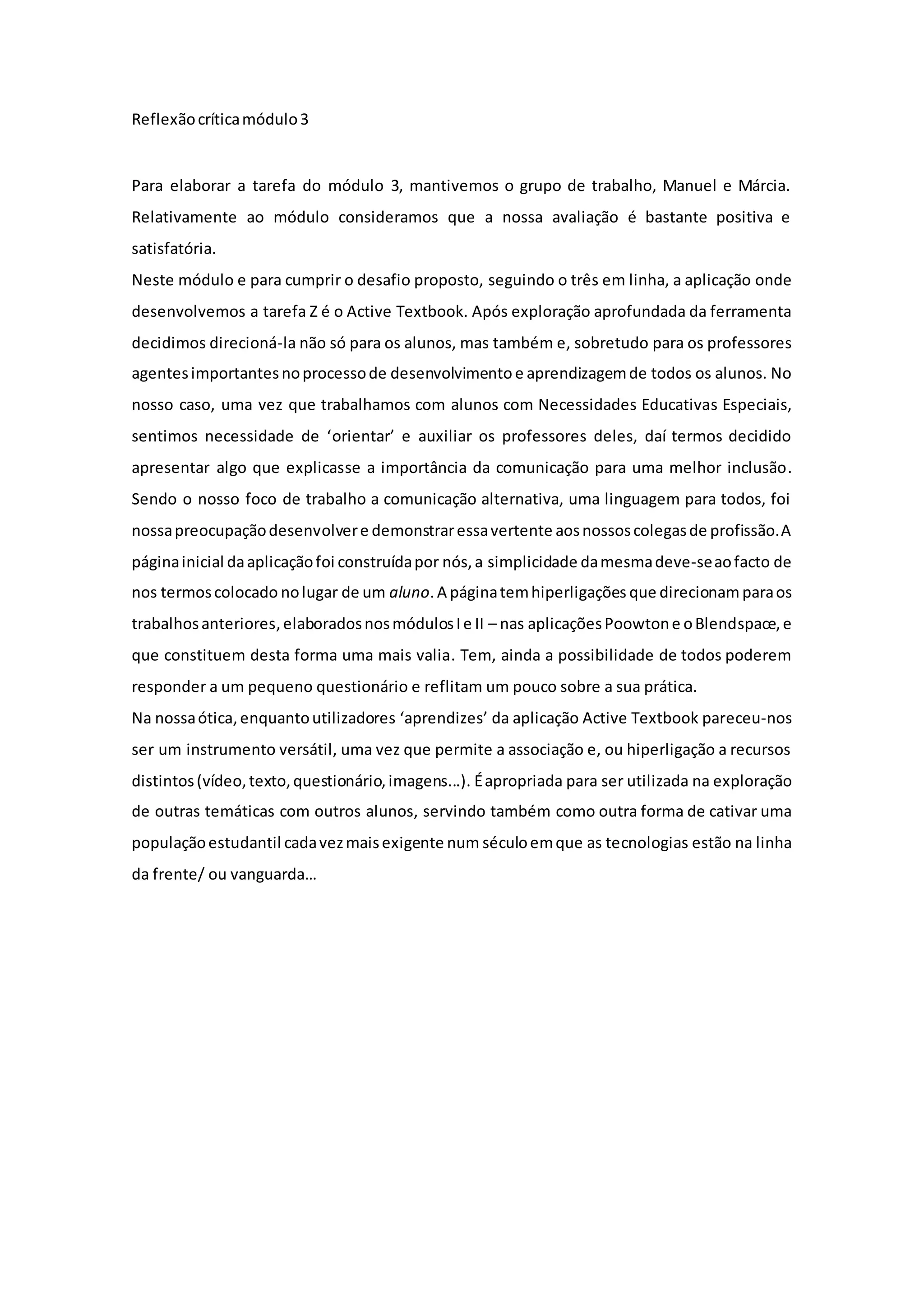 O grupo manteve o trabalho no módulo 3 com Manuel e Márcia. Eles consideraram sua avaliação positiva. Eles usaram a aplicação Active Textbook para compartilhar seu trabalho sobre comunicação alternativa com professores, a fim de melhorar a inclusão de alunos com necessidades educacionais especiais.
