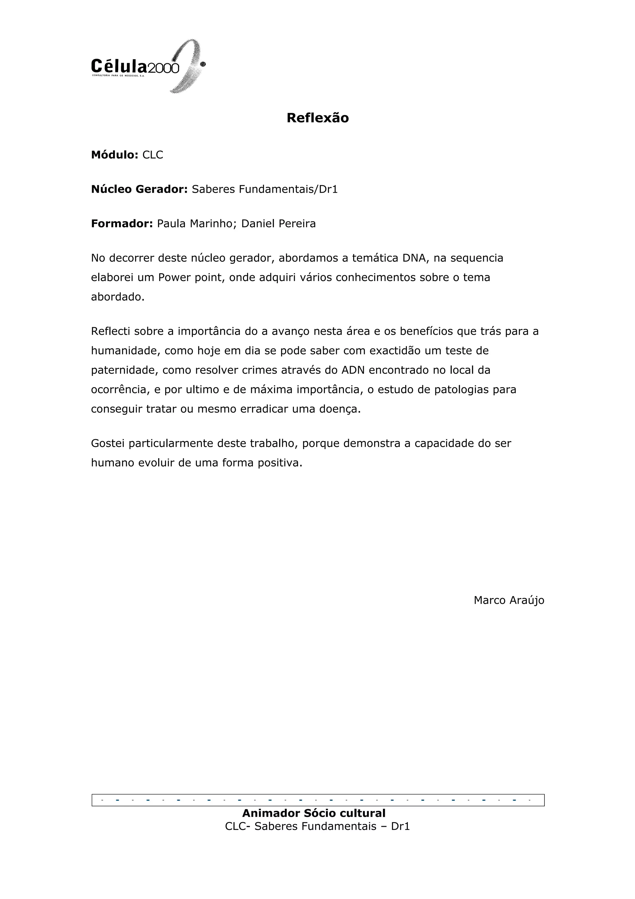 O estudante reflete sobre um núcleo gerador sobre DNA onde aprendeu sobre os avanços na área do DNA e seus benefícios, como testes de paternidade e resolução de crimes. O estudante aprecia como o estudo do DNA demonstra a capacidade humana de evoluir positivamente, como no tratamento e erradicação de doenças.