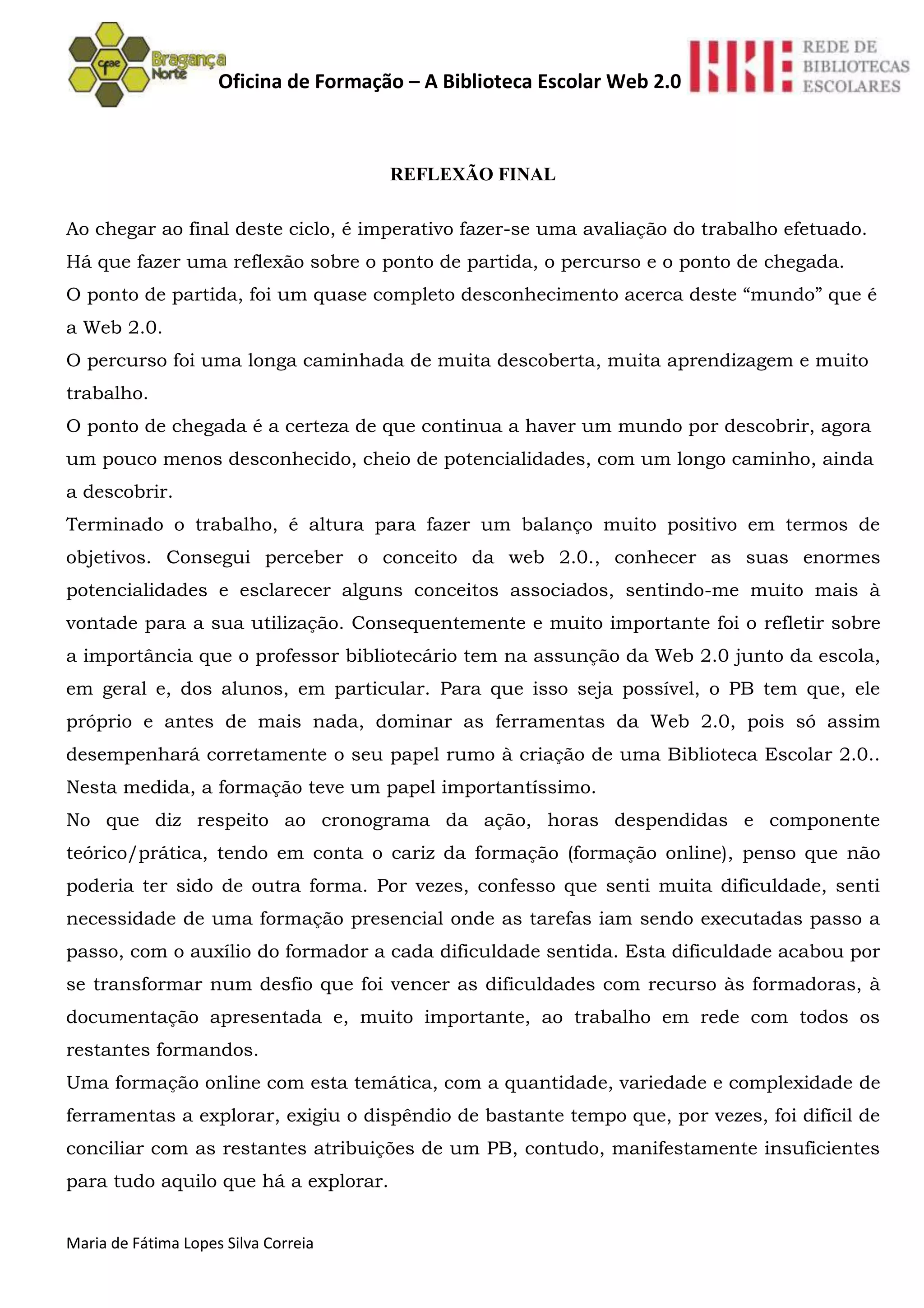 Este documento reflete sobre uma oficina de formação sobre a biblioteca escolar Web 2.0. Resume que o ponto de partida foi um desconhecimento sobre a Web 2.0, o percurso foi de muita aprendizagem, e o ponto de chegada é a certeza de que há mais para descobrir. A autora sente-se agora mais confortável com a Web 2.0 e seu potencial para bibliotecas escolares.