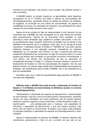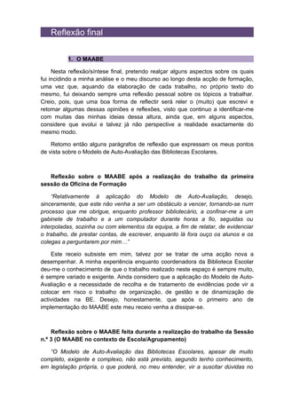 1. O autor reflete sobre sua experiência aplicando o Modelo de Auto-Avaliação das Bibliotecas Escolares (MAABE) ao longo de uma formação.
