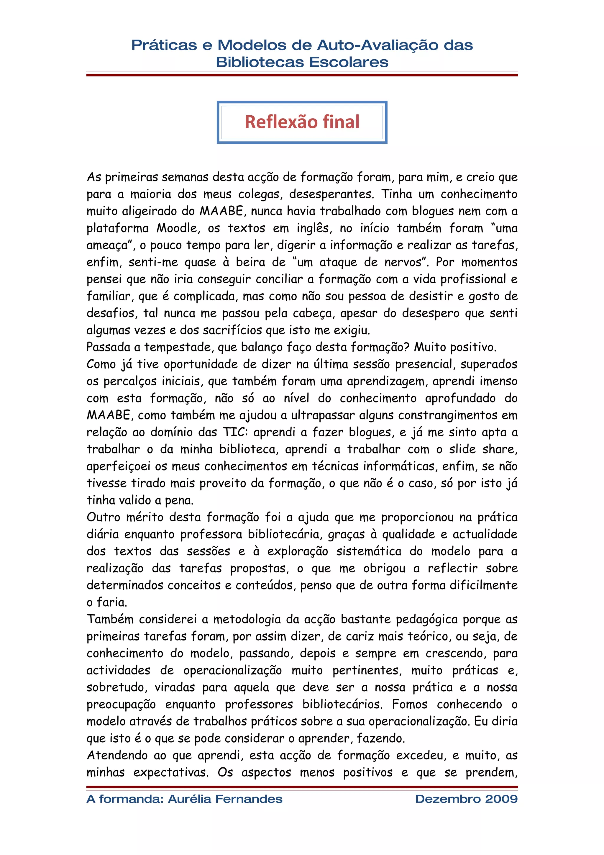 A formanda descreve sua experiência inicialmente difícil na formação devido à sua falta de familiaridade com os tópicos e plataformas. No entanto, ela superou esses desafios iniciais e aprendeu muito sobre o modelo de autoavaliação de bibliotecas escolares e habilidades com tecnologias da informação e comunicação. A metodologia da formação foi efetiva ao começar com tarefas teóricas e progressivamente incluir atividades práticas, ajudando a aplicar o conteúdo na prática diária. A formanda excedeu