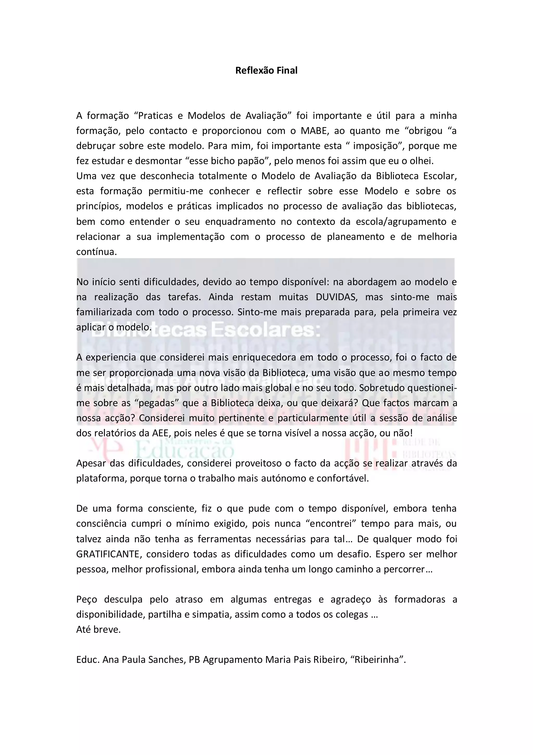 Este documento resume a reflexão de uma educadora sobre uma formação em práticas e modelos de avaliação de bibliotecas escolares. A formação ajudou a educadora a entender melhor o Modelo de Avaliação da Biblioteca Escolar e como aplicá-lo, embora tenha sentido algumas dificuldades com o tempo disponível. A experiência mais valiosa foi ganhar uma nova visão mais detalhada e global da biblioteca.