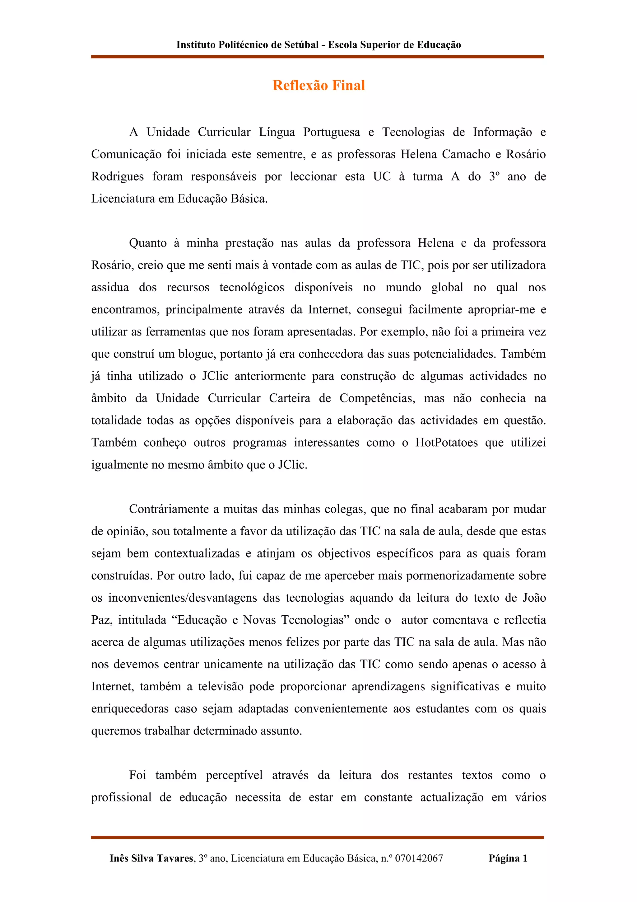 1) A aluna descreve sua experiência positiva com as aulas de TIC em comparação com as aulas de língua portuguesa.
