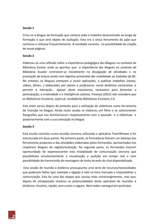 Este documento resume uma formação sobre ferramentas da Web 2.0 para bibliotecas escolares. A formação capacitou os participantes no uso de ferramentas como blogs, YouTube, SlideShare e redes sociais. A autora reflete sobre como cada sessão apresentou novas ferramentas e como isso pode melhorar o trabalho das bibliotecas escolares.
