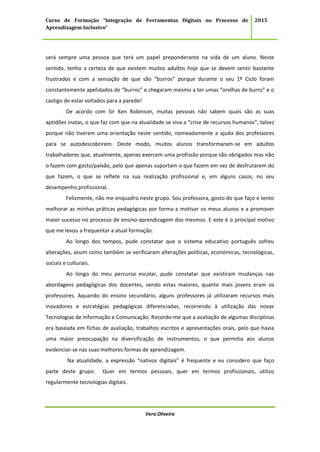 O documento descreve a reflexão de Vera Oliveira sobre sua aprendizagem e prática pedagógica. Ela realizou um teste VARK que mostrou que seu estilo de aprendizagem é visual, embora os outros estilos sejam semelhantes. Sua visão sobre educação mudou ao longo do tempo, e agora ela procura usar várias ferramentas e estratégias para atender aos diferentes estilos de aprendizagem de seus alunos e tornar o processo mais inclusivo.