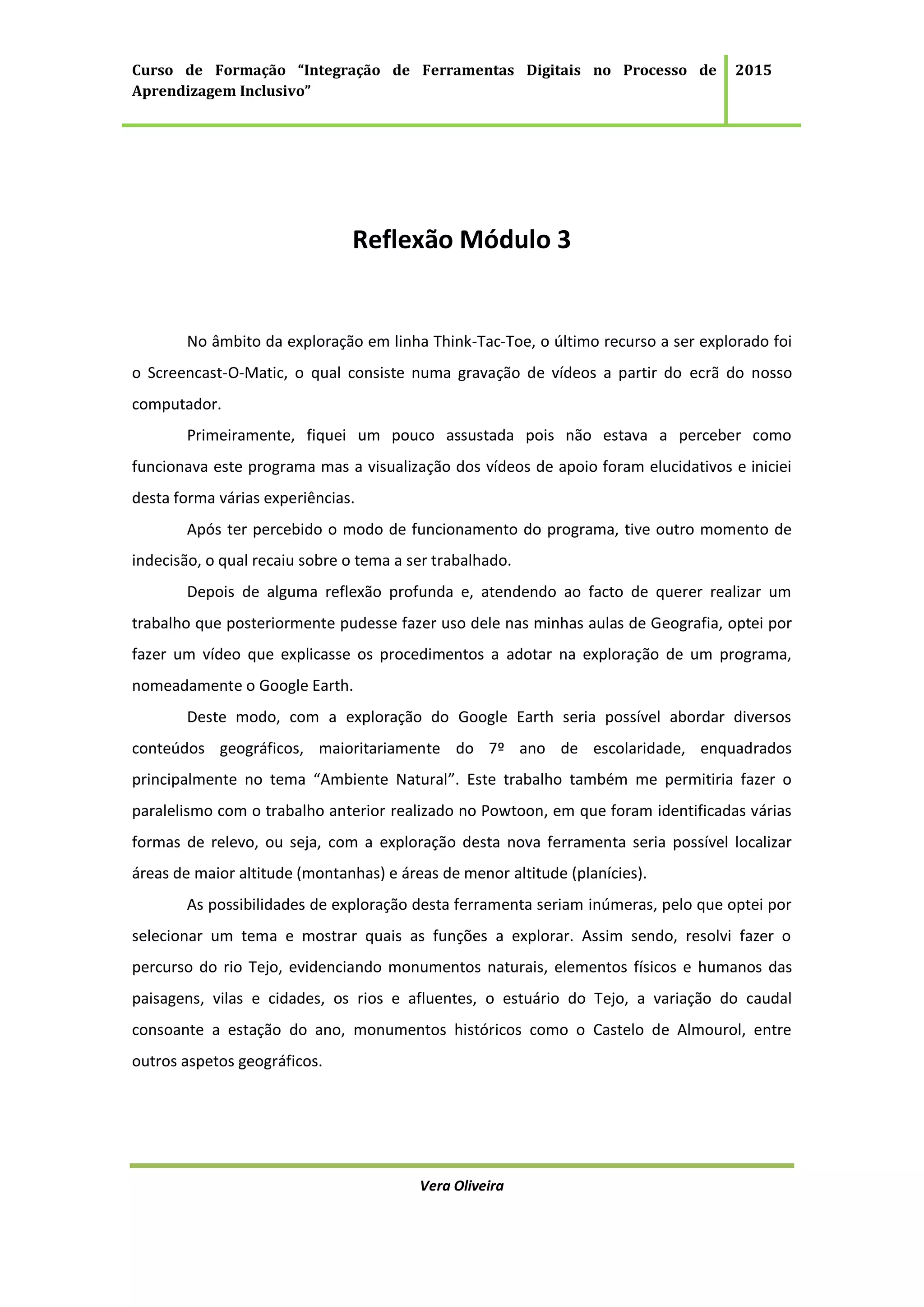Este documento descreve a experiência de Vera Oliveira com a ferramenta Screencast-O-Matic para criar um vídeo explicativo sobre a utilização do Google Earth para ensinar geografia. Inicialmente, Vera ficou insegura sobre como usar o Screencast-O-Matic, mas após ver vídeos de apoio, compreendeu seu funcionamento. Ela então decidiu criar um vídeo sobre o rio Tejo em Portugal usando o Google Earth para mostrar aspectos geográficos. Após concluir o vídeo, Vera publicou-