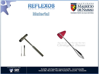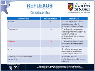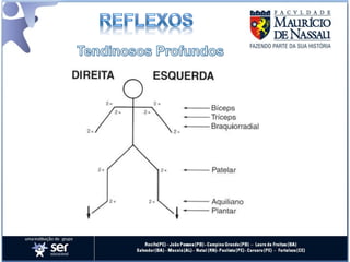 O documento descreve os componentes e classificação do sistema nervoso, incluindo receptores, condução nervosa e tipos de respostas. Ele também fornece exemplos de exames neurológicos com respostas esperadas para diferentes estímulos.