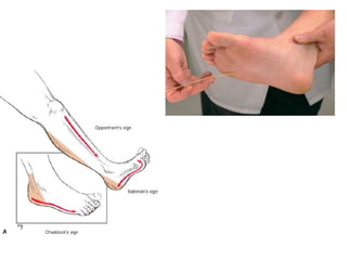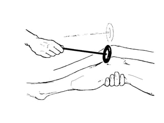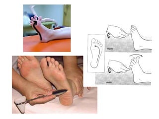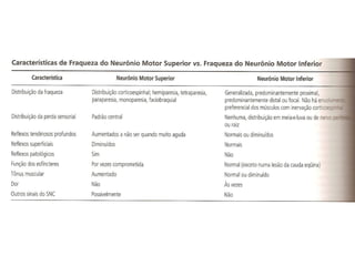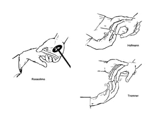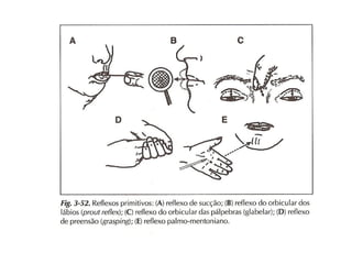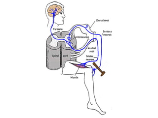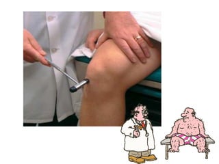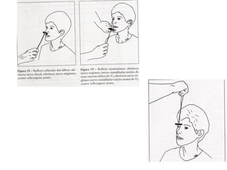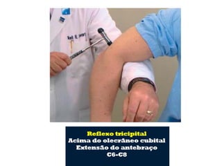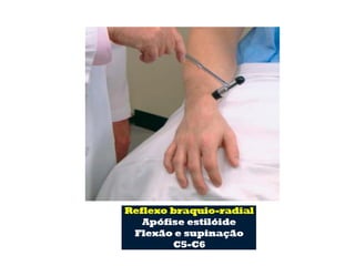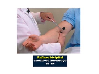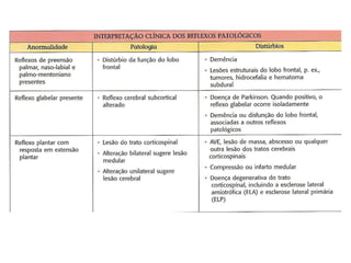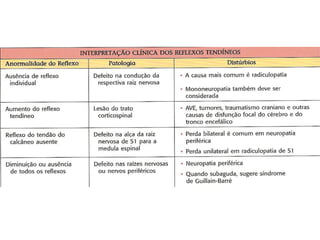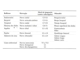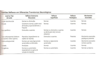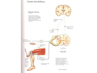 O documento descreve os principais tipos de reflexos no corpo humano, incluindo reflexos proprioceptivos como o reflexo miotático e reflexos cutâneos. Discutem-se as vias neurais envolvidas nos arcos reflexos e como lesões neurológicas podem alterar os reflexos, tornando-os ausentes, diminuídos ou exagerados.
