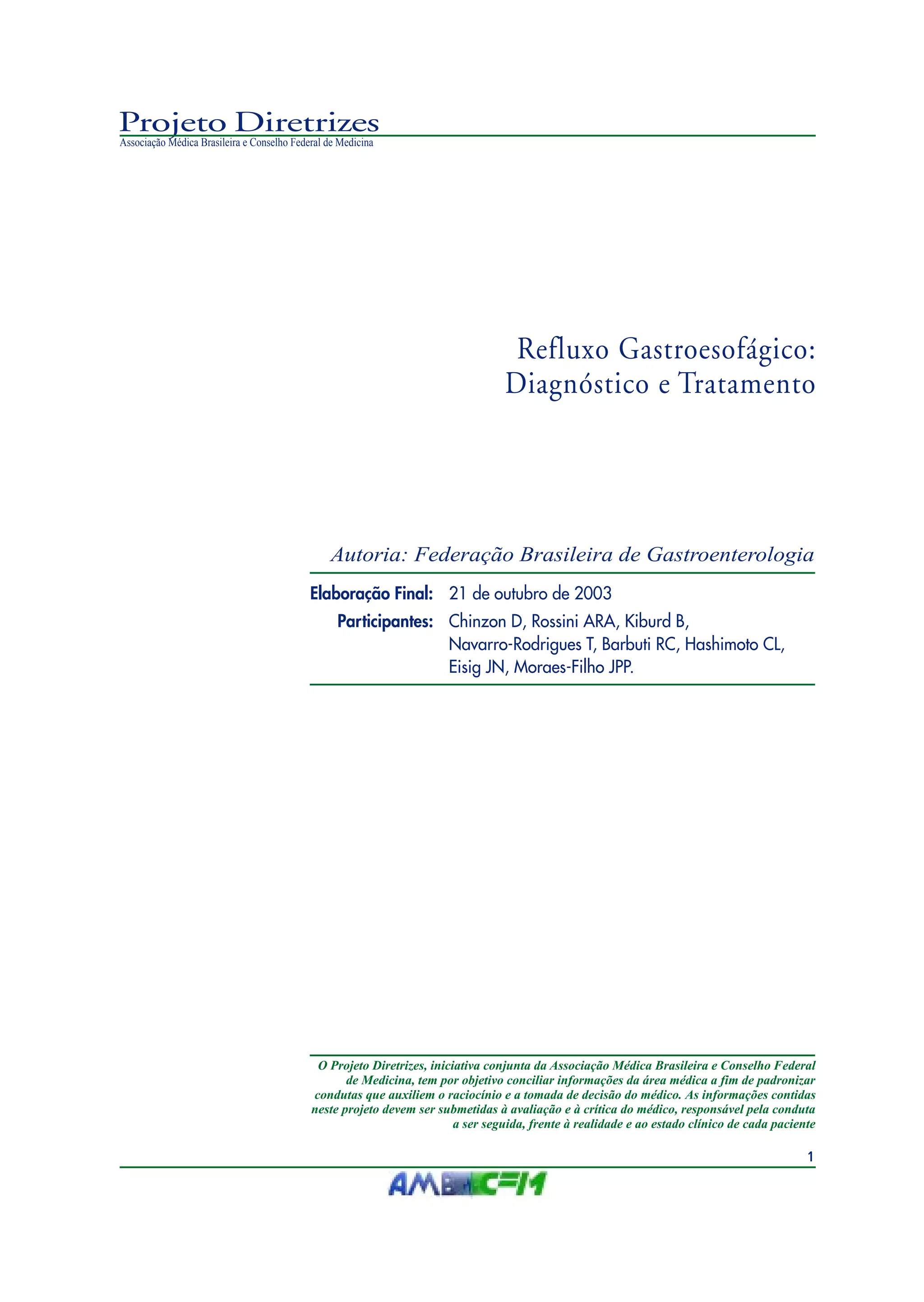 O Projeto Diretrizes, desenvolvido pela Associação Médica Brasileira e o Conselho Federal de Medicina, visa padronizar o diagnóstico e tratamento da Doença do Refluxo Gastroesofágico (DRGE) através de revisões de literatura e consensos. Este documento detalha métodos de diagnóstico, como anamnese, endoscopia e pHmetria, e define as manifestações clínicas da DRGE, enfatizando a importância de considerar o estado clínico de cada paciente. Conflitos de interesse não foram declarados, e o projeto foi finalizado em outubro de 2003.