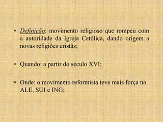 1. O movimento da Reforma Protestante surgiu no século XVI em oposição à autoridade da Igreja Católica.