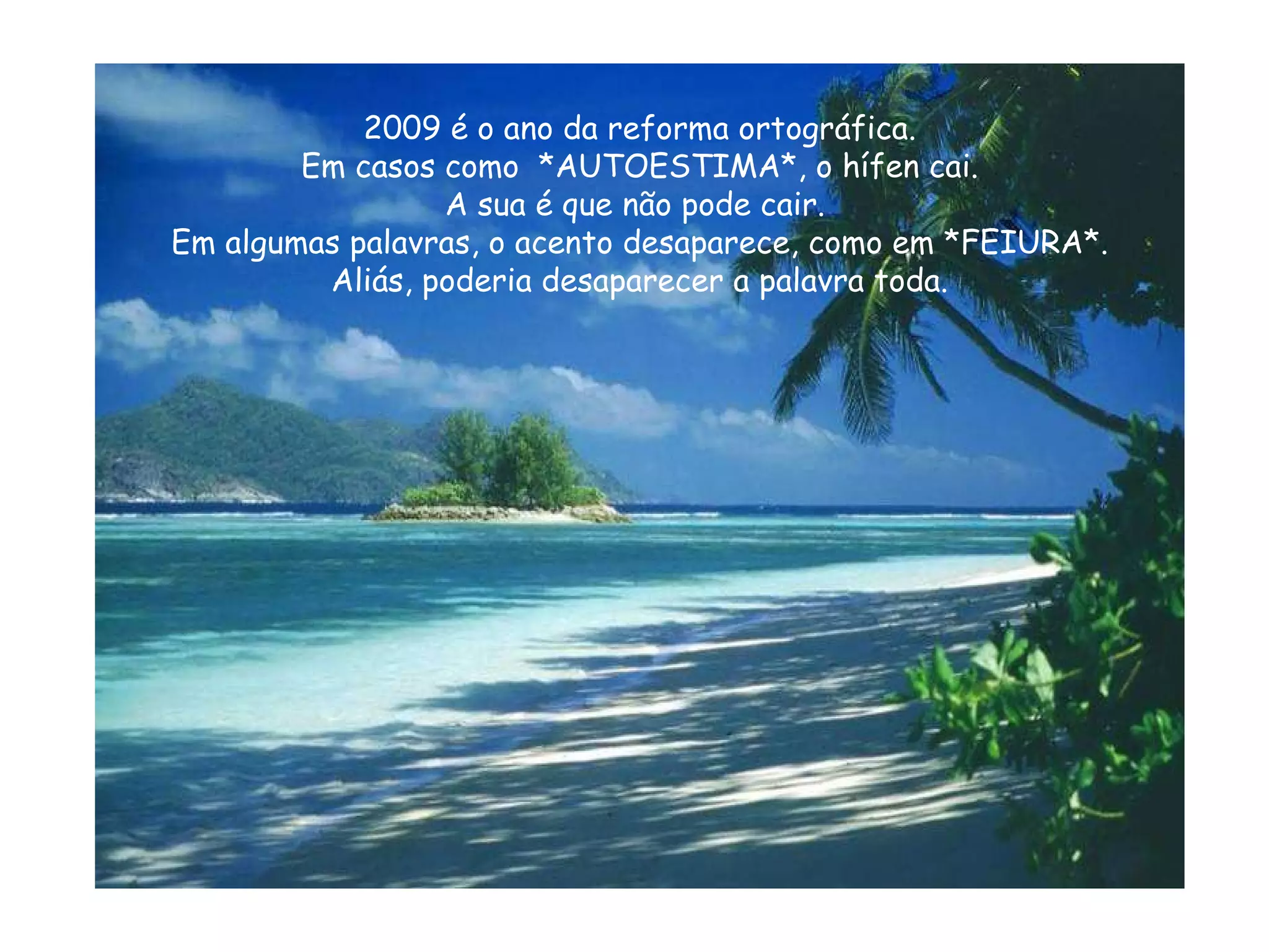 A reforma ortográfica de 2009 eliminou hífens e acentos em algumas palavras como "autoestima" e "feiura", mas manteve outros como em "ideia" e "consciência". Embora tenham desaparecido tremas e acentos em palavras como "inconsequência", expressões como "Eu te amo" continuam precisando de pontuação. A vida continua mudando com o tempo.