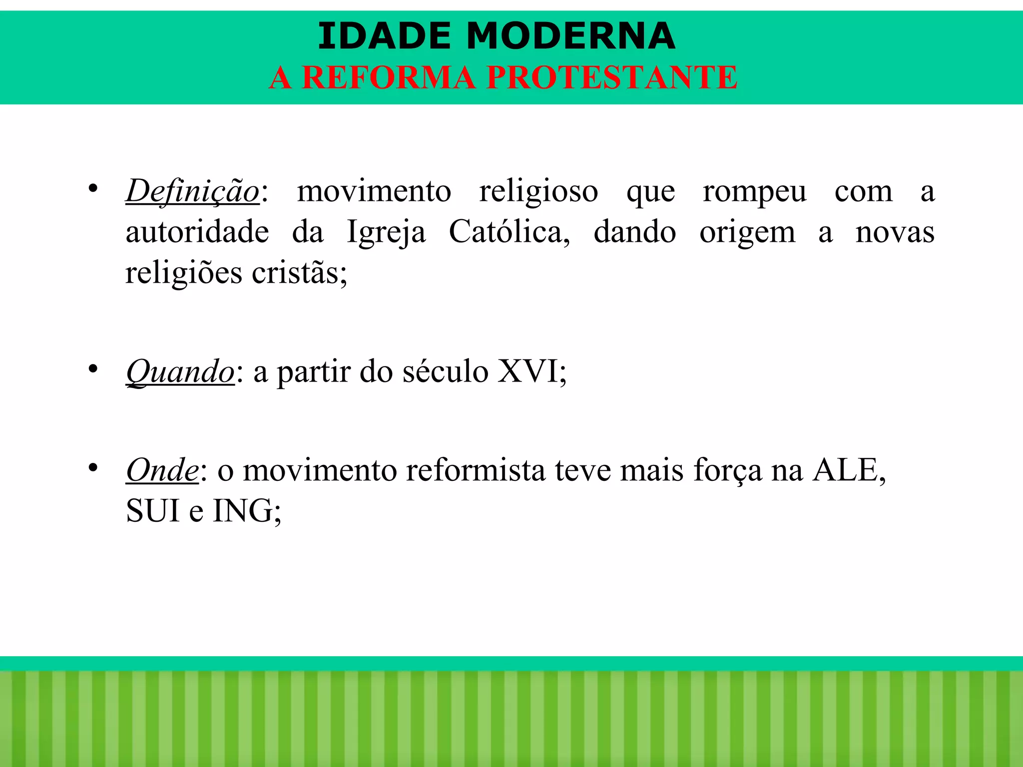 O documento descreve a Reforma Protestante, que surgiu no século XVI na Alemanha com Martinho Lutero criticando a Igreja Católica. Isso deu origem a novas religiões como o luteranismo, calvinismo e anglicanismo, enquanto a Igreja Católica respondeu com a Contra Reforma para conter o avanço protestante.