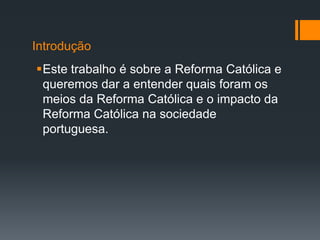 Este documento discute a Reforma Católica em Portugal, incluindo seus objetivos de renovar a Igreja Católica em resposta à Reforma Protestante, os meios utilizados como o Concílio de Trento, a Companhia de Jesus, a Inquisição e o Índex, e seu impacto na sociedade portuguesa através da formação do clero, educação e perseguição de hereges.