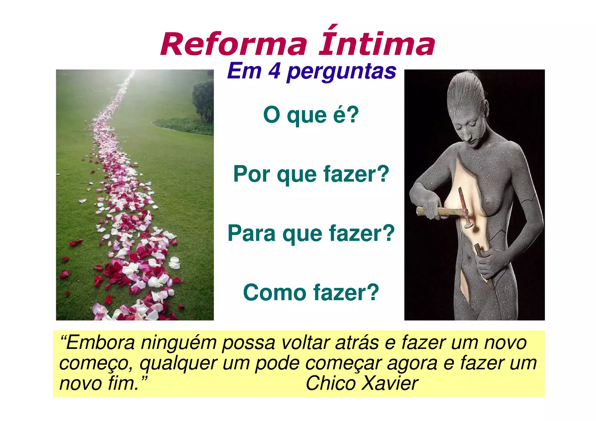 O documento discute a reforma íntima, definindo-a como um processo contínuo de autoconhecimento e transformação pessoal baseado nos ensinamentos cristãos. Ele explica por que fazer a reforma íntima (para cumprir mandamentos cristãos e alcançar a perfeição), para que fazer (evitar arrependimento, conhecer a si mesmo e alcançar progresso moral e felicidade) e como fazer (através da autoanálise, seguindo ensinamentos de Santo Agostinho, os princípios de Benjamin Franklin e os lemas do