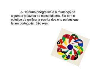 O documento descreve as principais mudanças da Reforma Ortográfica do português nos países lusófonos, incluindo a remoção do trema e acentos em certas palavras, a adição de letras ao alfabeto e sites com jogos sobre o tema.