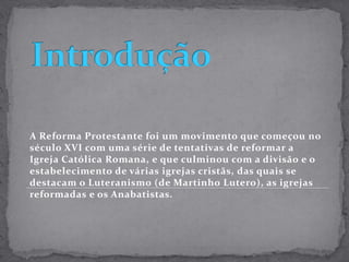 A Reforma Protestante iniciou no século XVI como um movimento para reformar a Igreja Católica Romana e resultou na divisão e criação de novas igrejas cristãs como o Luteranismo de Martinho Lutero. Foi iniciada na Alemanha e espalhou-se para outros países europeus. Lutero protestou contra indulgências e a autoridade do Papa e defendeu que a salvação vem da fé e não das obras.