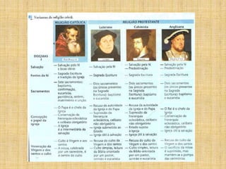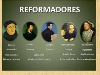 O documento discute a Reforma Protestante, começando com a corrupção da Igreja Católica medieval que levou Martinho Lutero a publicar suas 95 Teses em 1517 criticando a venda de indulgências. Isso deu início ao movimento protestante que questionava a autoridade papal e defendia a salvação pela fé. Outros movimentos como o Calvinismo e o Anglicanismo também surgiram neste período em oposição à Igreja Católica.