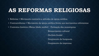 O documento discute as reformas religiosas no período da Baixa Idade Média, incluindo as reformas luterana, calvinista e anglicana. Também aborda os fatores que levaram à Reforma Protestante e as ações da Contrarreforma Católica em resposta.