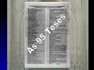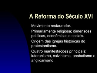 1. A Reforma Protestante iniciou-se em 1517 com as 95 Teses de Martinho Lutero contra as indulgências. Isso levou ao surgimento de várias igrejas protestantes como luteranismo, calvinismo, anabatismo e anglicanismo.