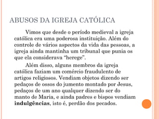O documento resume os principais pontos da Reforma Protestante: (1) Lutero critica a venda de indulgências pela Igreja Católica em 1517; (2) Henrique VIII rompe com Roma para se casar novamente, estabelecendo a Igreja Anglicana; (3) A Reforma se espalha por outros países como a República Tcheca e a Inglaterra.