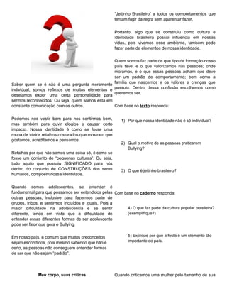 O documento discute como o contexto social influencia a identidade das pessoas e como vivemos em uma rede de relações. Argumenta que nossa identidade é formada por muitos elementos culturais e sociais com os quais interagimos, e não é algo puramente individual. Também reflete sobre como a aparência das pessoas é constantemente julgada com base em padrões de beleza irreais e excludentes.