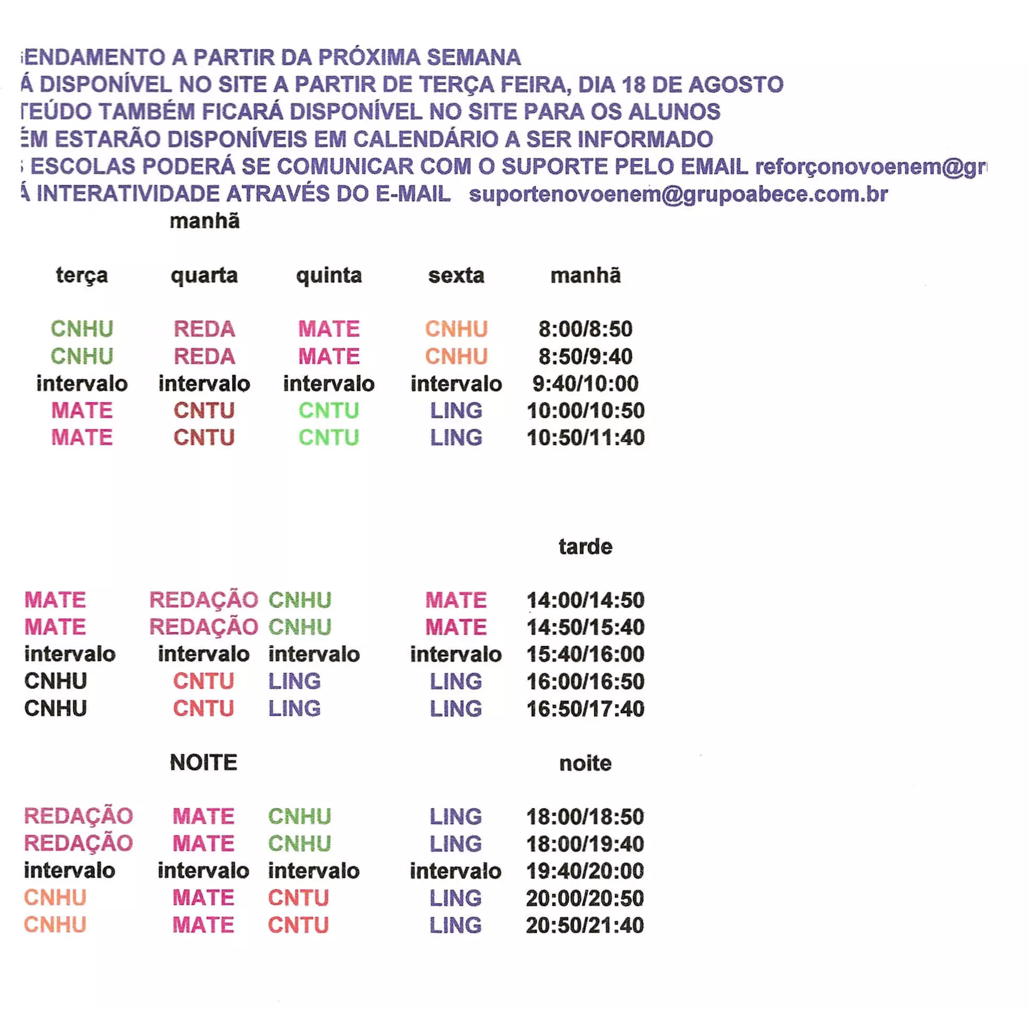 1) O cronograma de aulas do Enem estará disponível no site a partir da próxima semana.