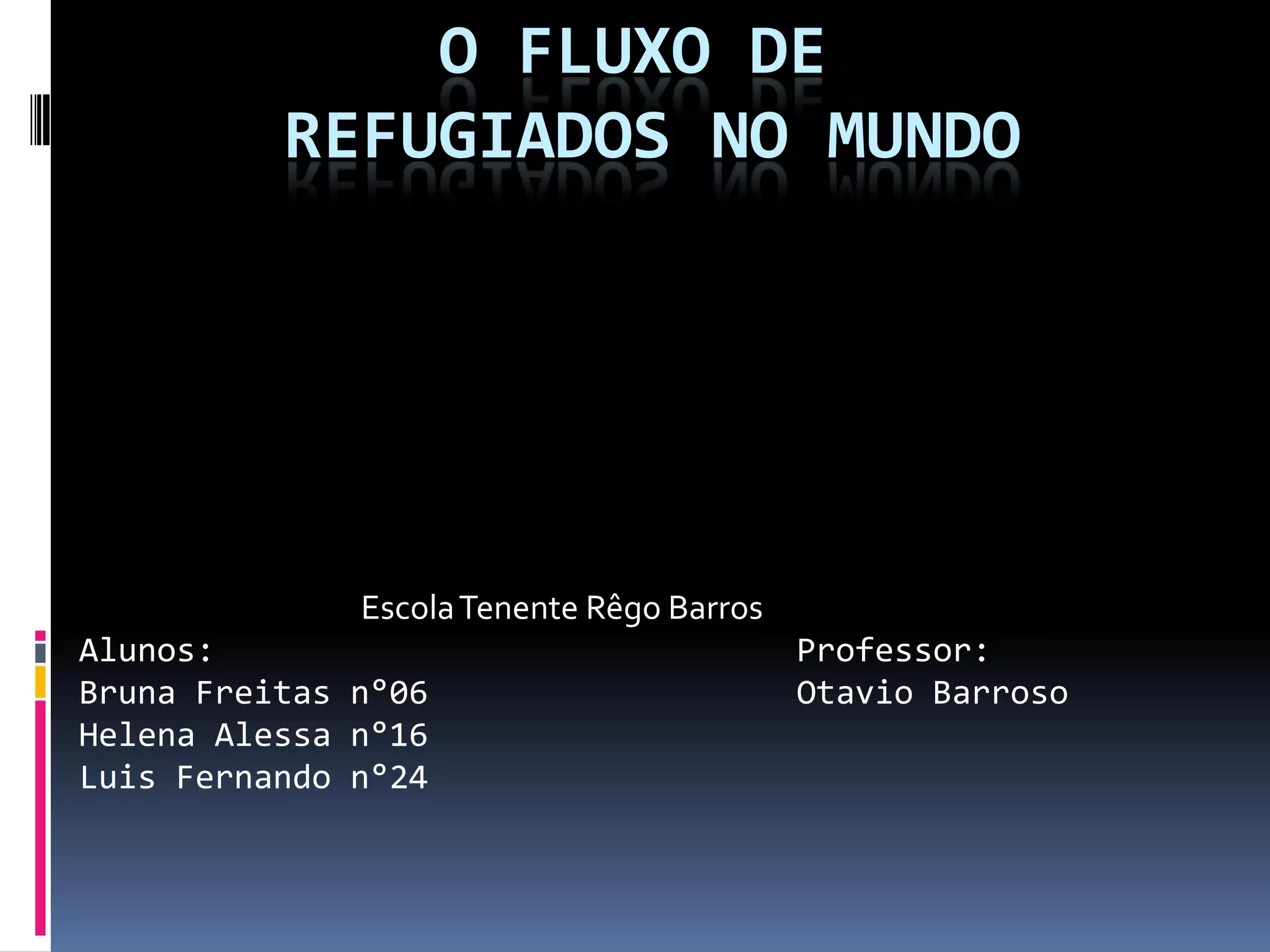 Este documento discute o fluxo de refugiados no mundo. Ele define quem é um refugiado segundo a convenção da ONU e diferencia refugiados de imigrantes. Apresenta as principais causas que fazem as pessoas se tornarem refugiadas, como conflitos, guerras e perseguições, e os locais com maior número de refugiados, como Síria, Palestina e Alemanha. Também aborda a situação dos refugiados no Brasil e o papel de organizações como a ACNUR no apoio a refugiados.