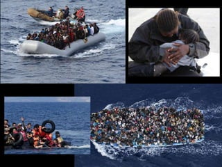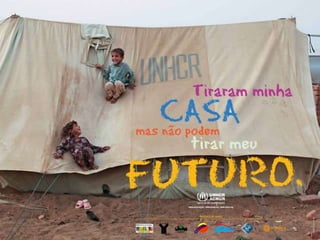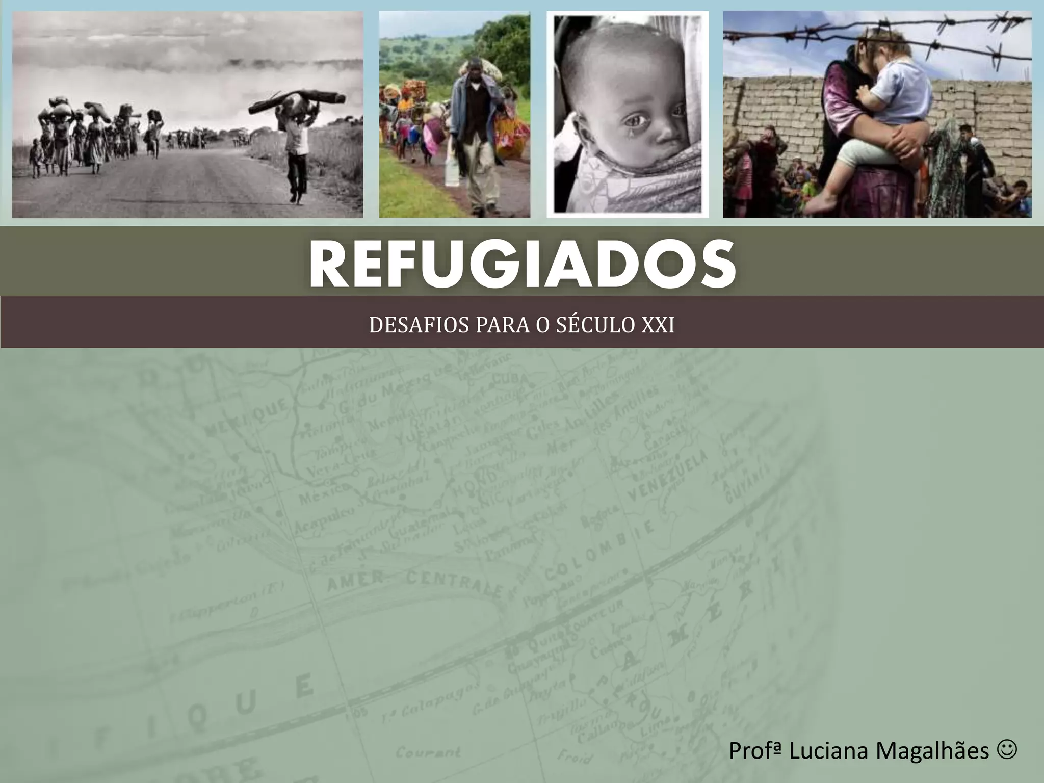 O documento discute os desafios enfrentados pelos refugiados no século 21. Apresenta a definição legal de refugiado segundo a Convenção de Genebra e diferencia refugiados de imigrantes. Também descreve as principais crises de refugiados na atualidade, como a guerra civil na Síria que gerou milhões de refugiados para a Europa.